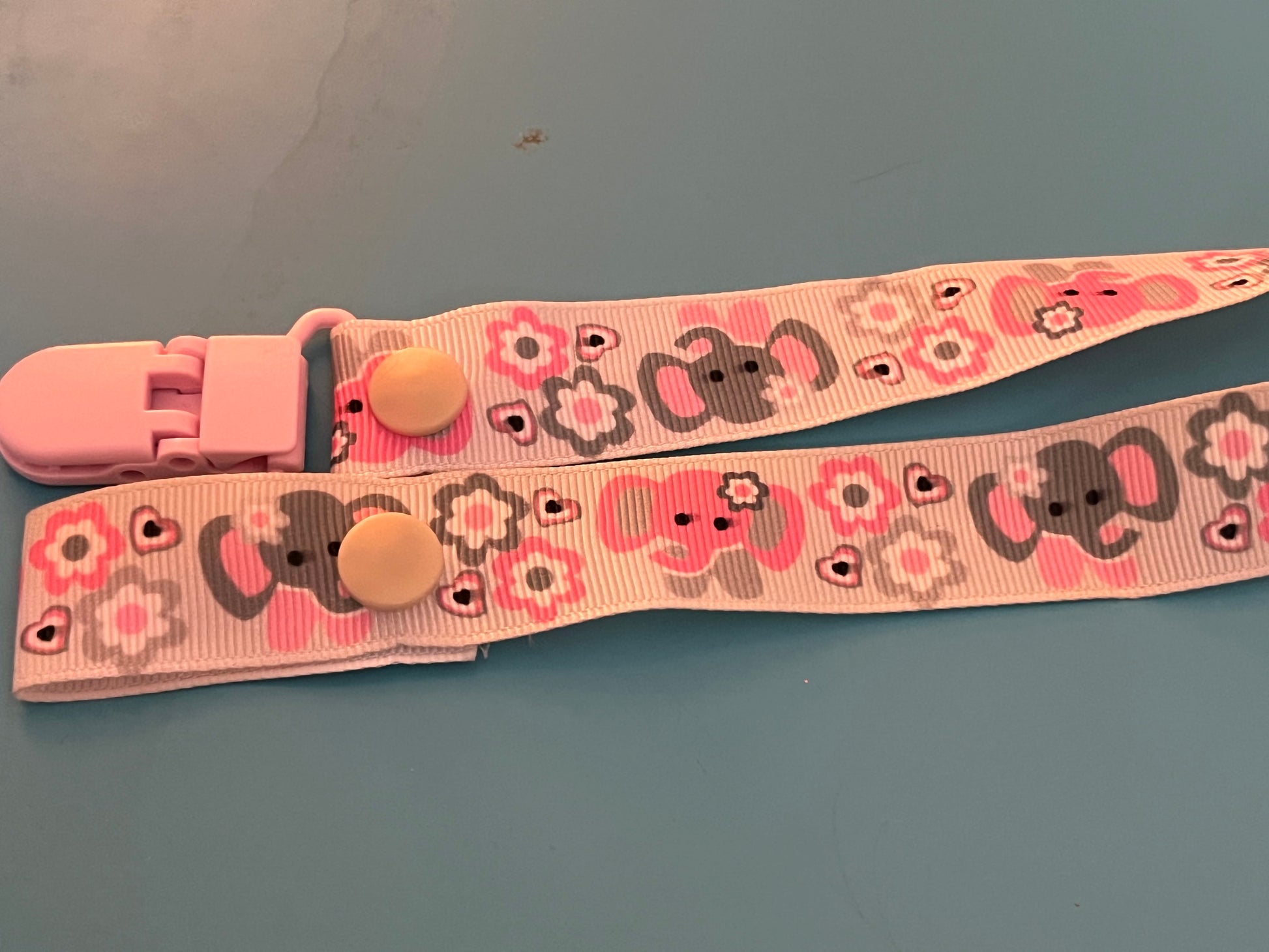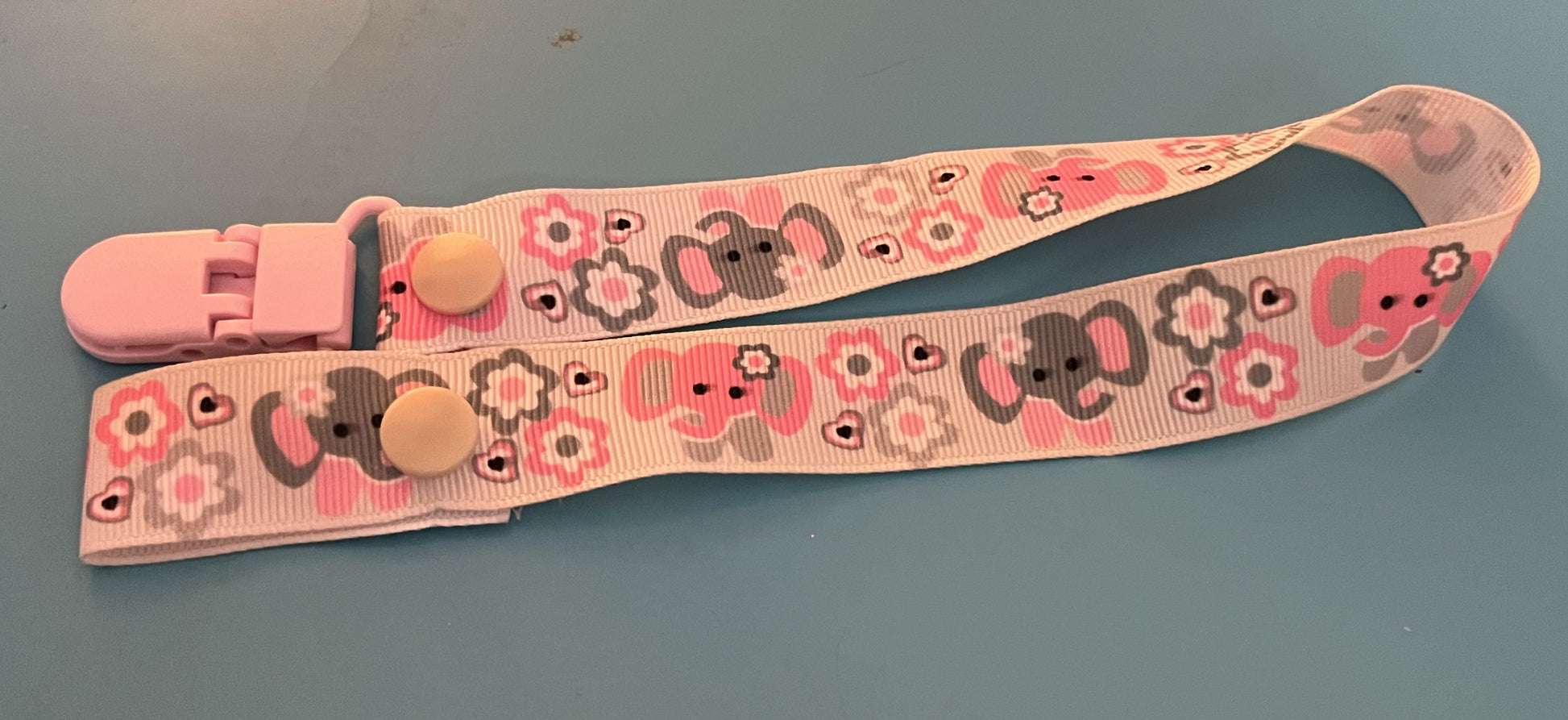 This is a pacifier clip made from grosgrain ribbon. It has a pattern of baby elephants. If you want the clip and/or snaps a certain color, please tell me, as they are usually chosen at random.