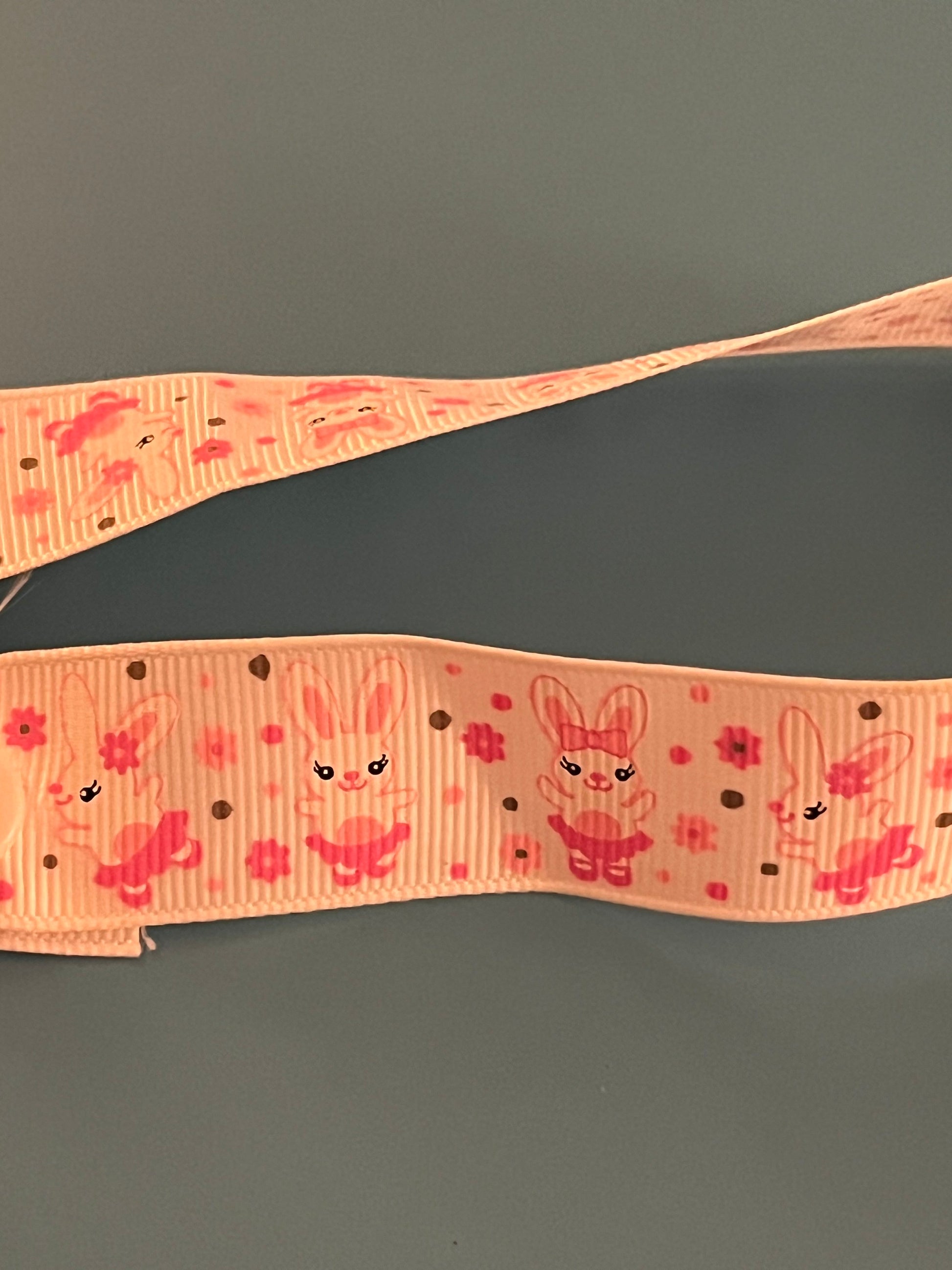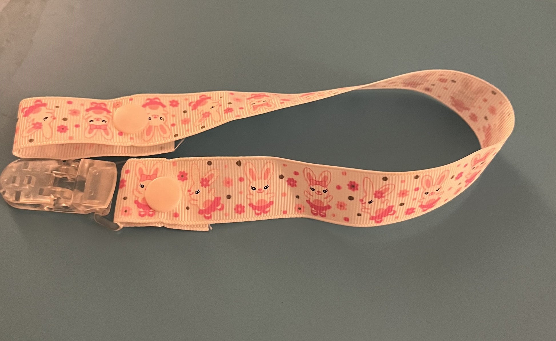 This is a pacifier clip made from grosgrain ribbon. It features a pattern of a ballerina bunny. If you want the clip and/or snaps a certain color, please tell me, as they are usually chosen at random.