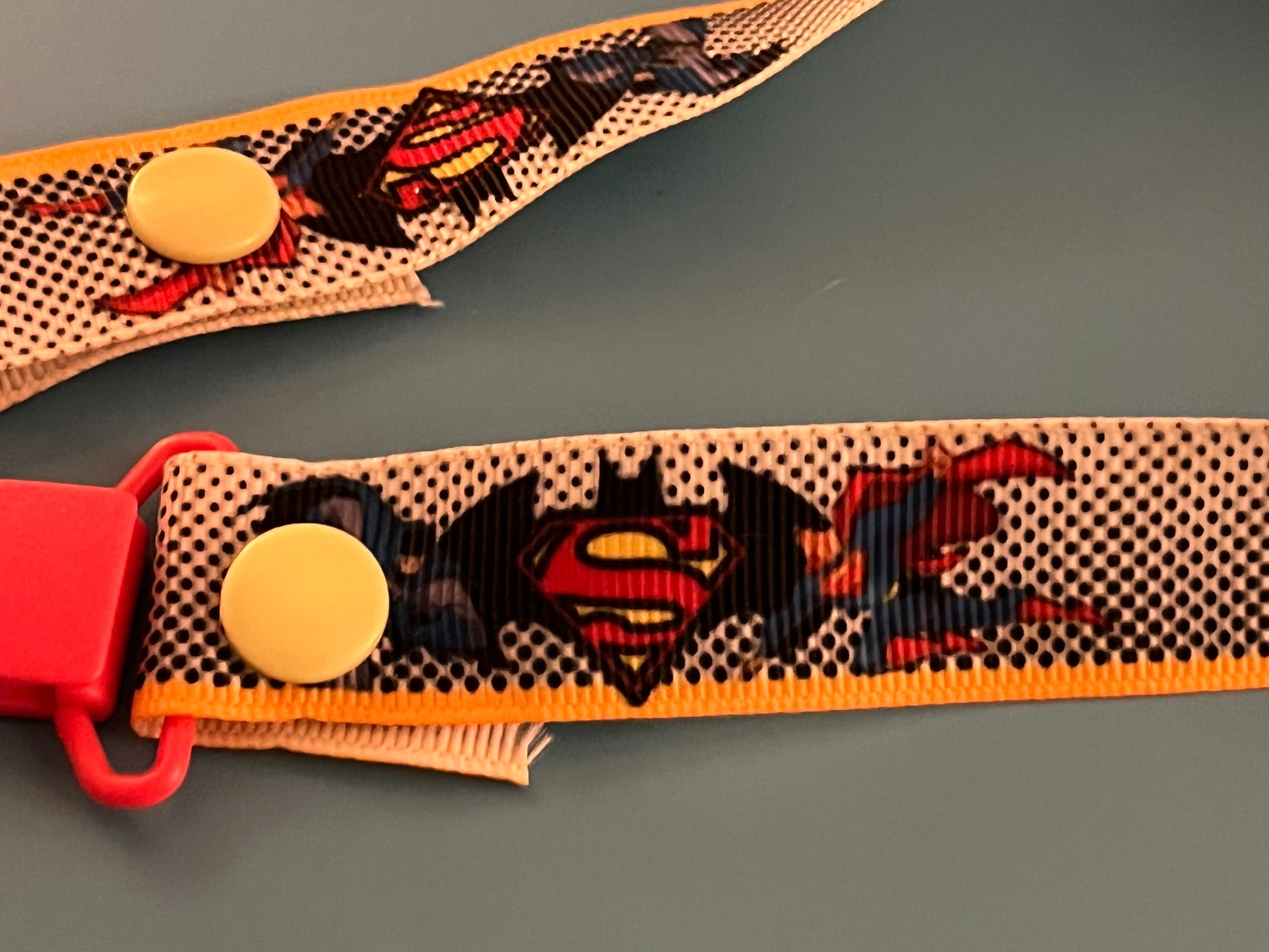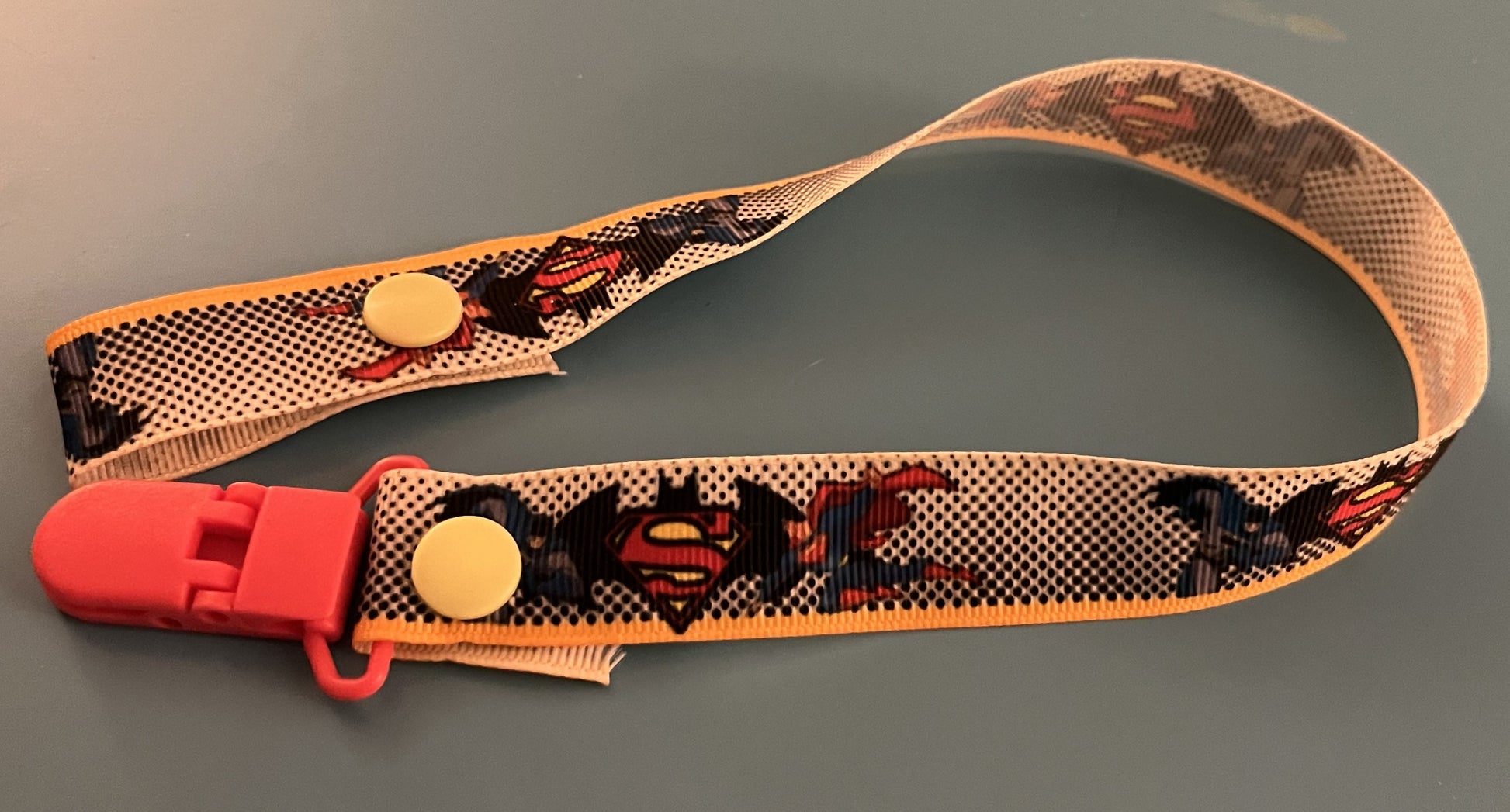 This is a pacifier clip made from grosgrain ribbon. It has a pattern of Batman vs Superman. If you want the clip and/or snaps a certain color, please tell me, as they are usually chosen at random.