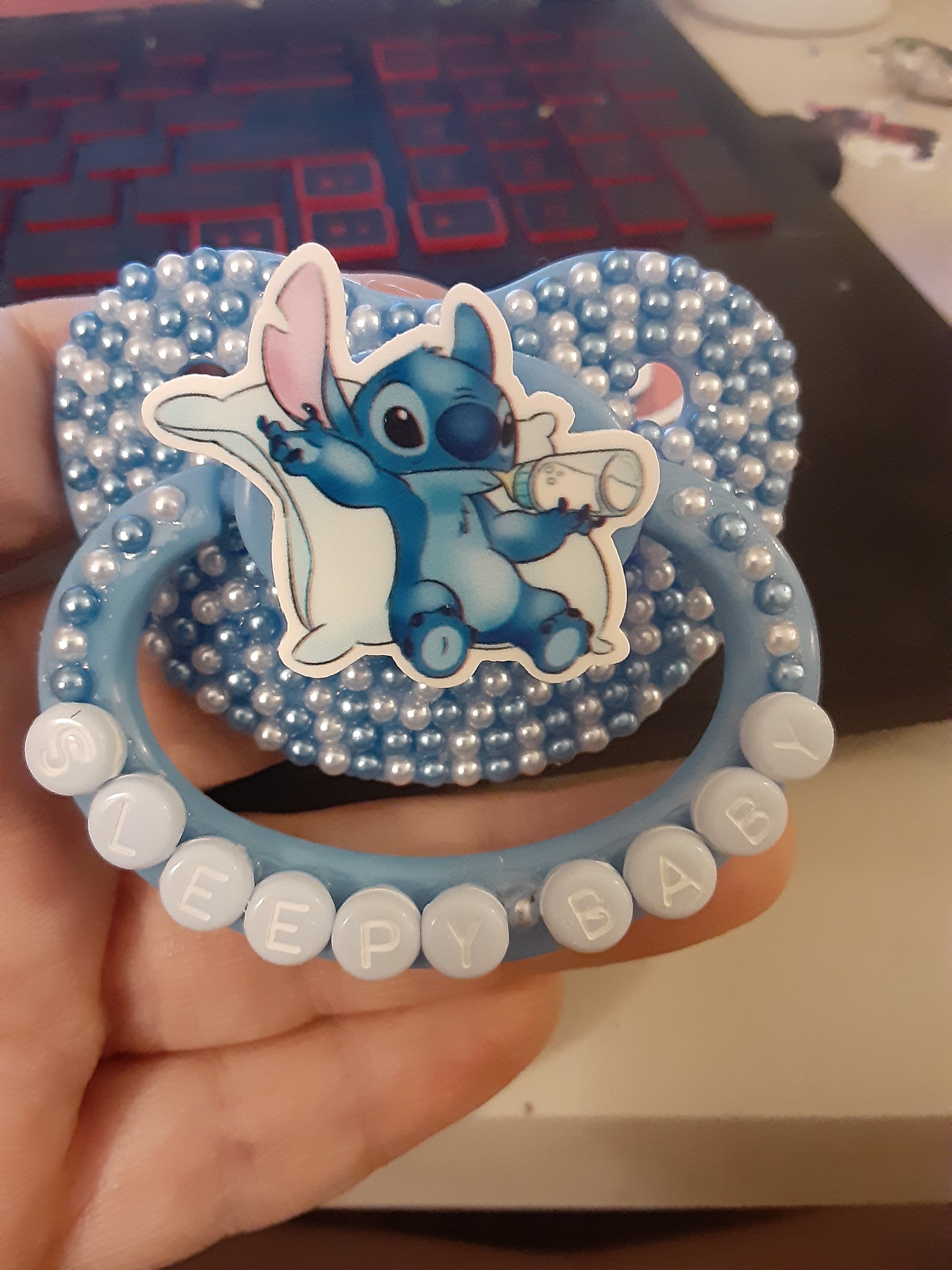 This is a light blue adult pacifier with a Stitch center. It's covered in blue and white pearls and says "Sleepy Baby" on the handle in blue alpha beads. If you like this product but would like a variation, get in touch with me, as I'm willing to make something custom.