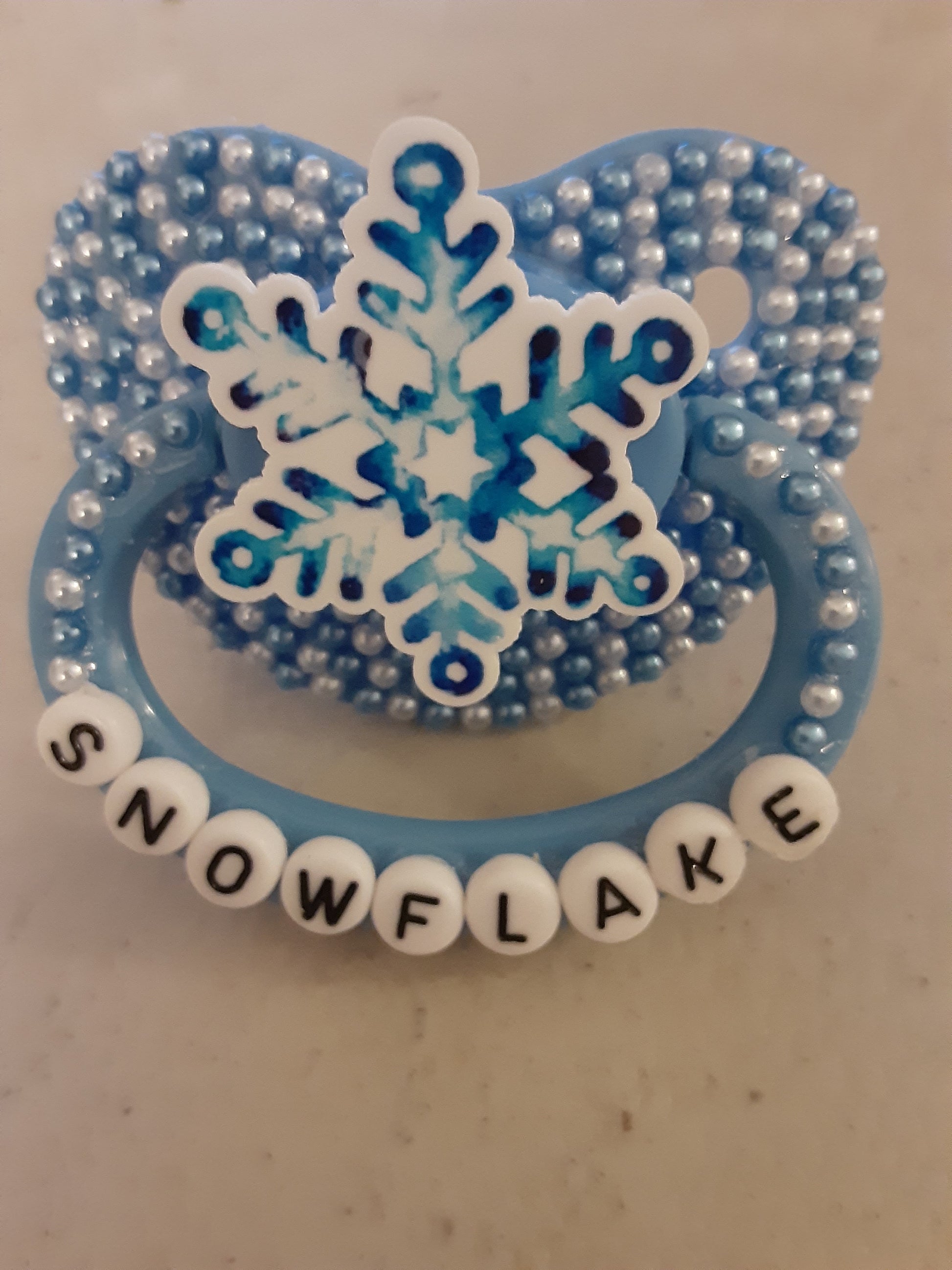This is a light blue adult pacifier with a snowflake center. It is covered in blue and white pearls and says 'Snowflake' on the handle in white alpha beads. If you like this product but would like a variation, get in touch with me, as I'm willing to make something custom.