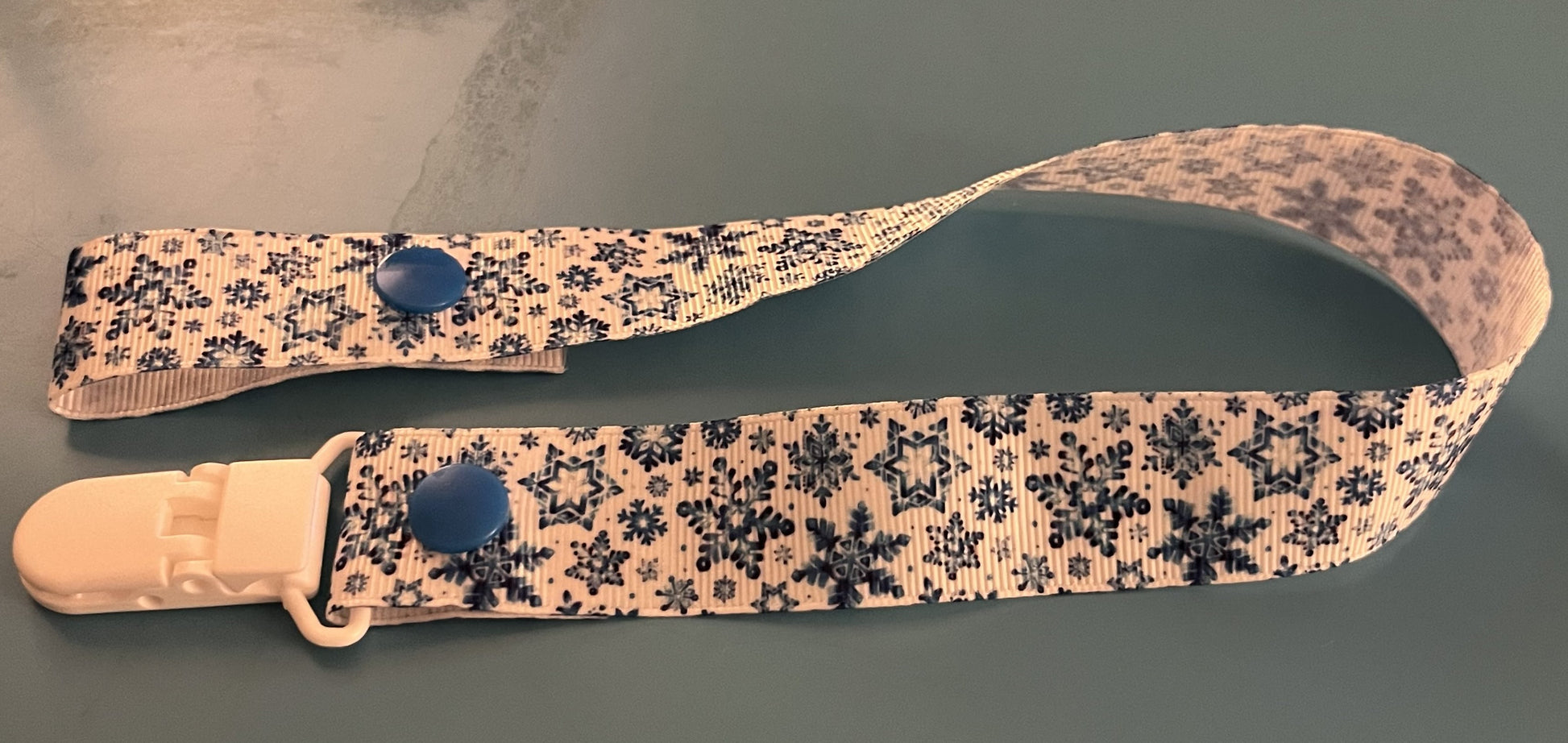 This is a pacifier clip that's made from grosgrain ribbon. It has a pattern of blue snowflakes. If you want the clip and/or snaps a certain color, please tell me, as they are usually chosen at random.