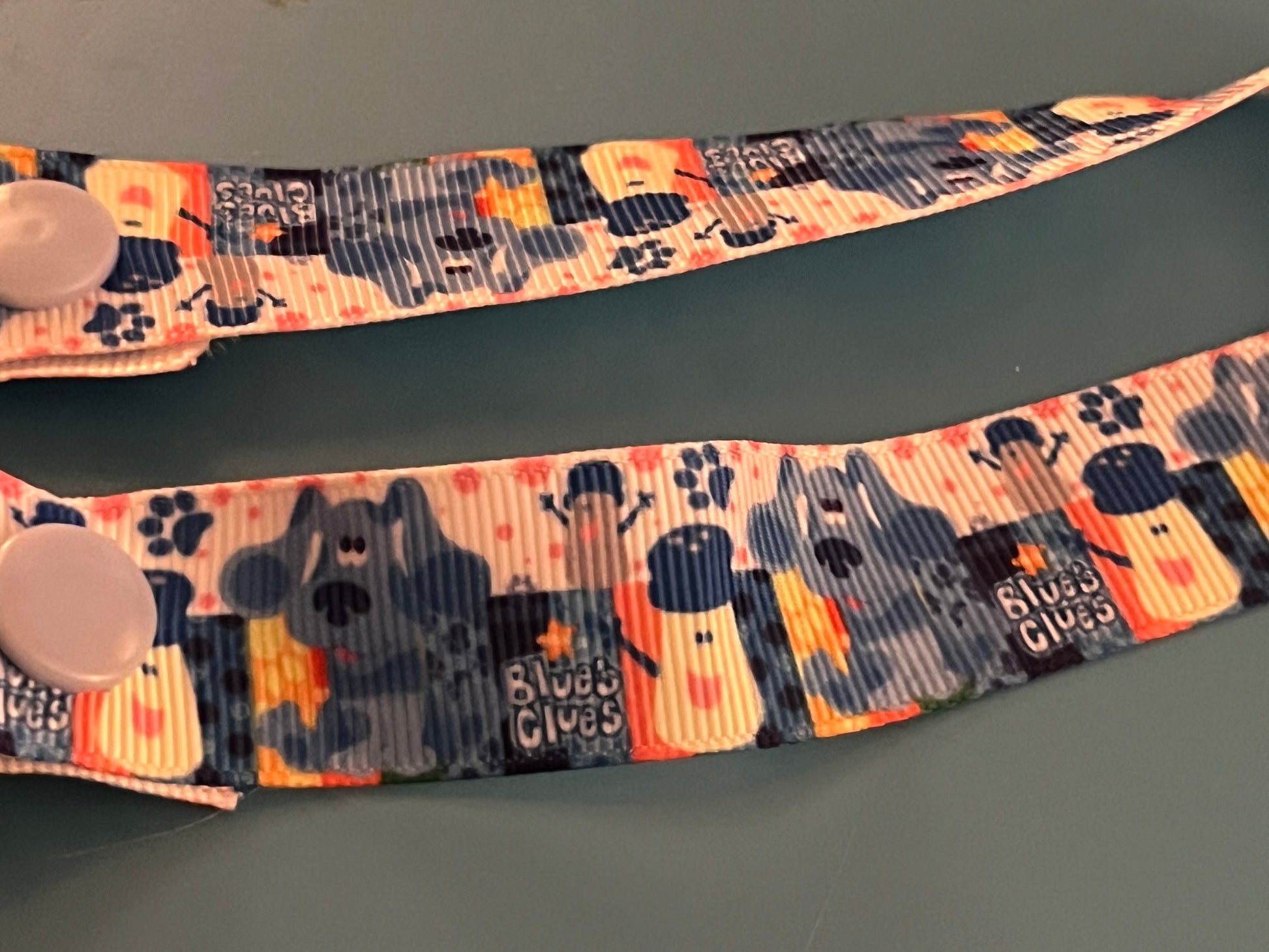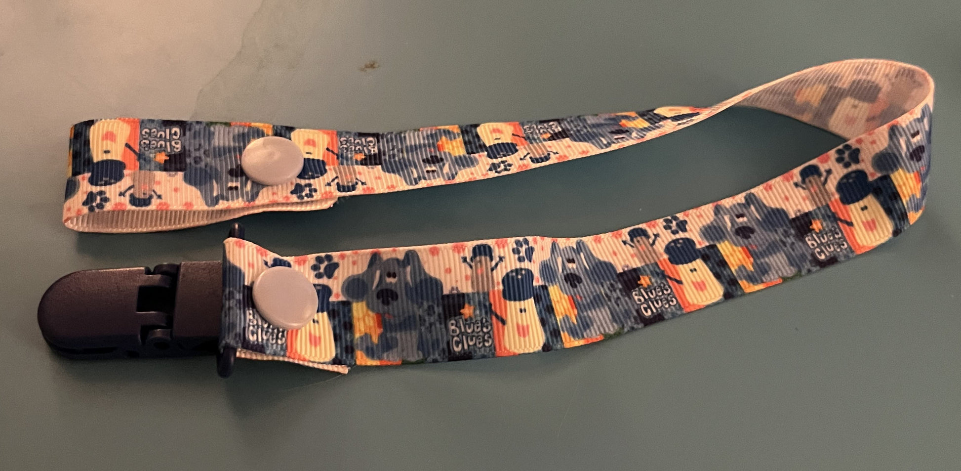 This is a pacifier clip made from grosgrain ribbon. It has a pattern of Blue, Mr. Salt, and Mrs. Pepper. If you want the clip and/or snaps a certain color, please tell me, as they are usually chosen at random.