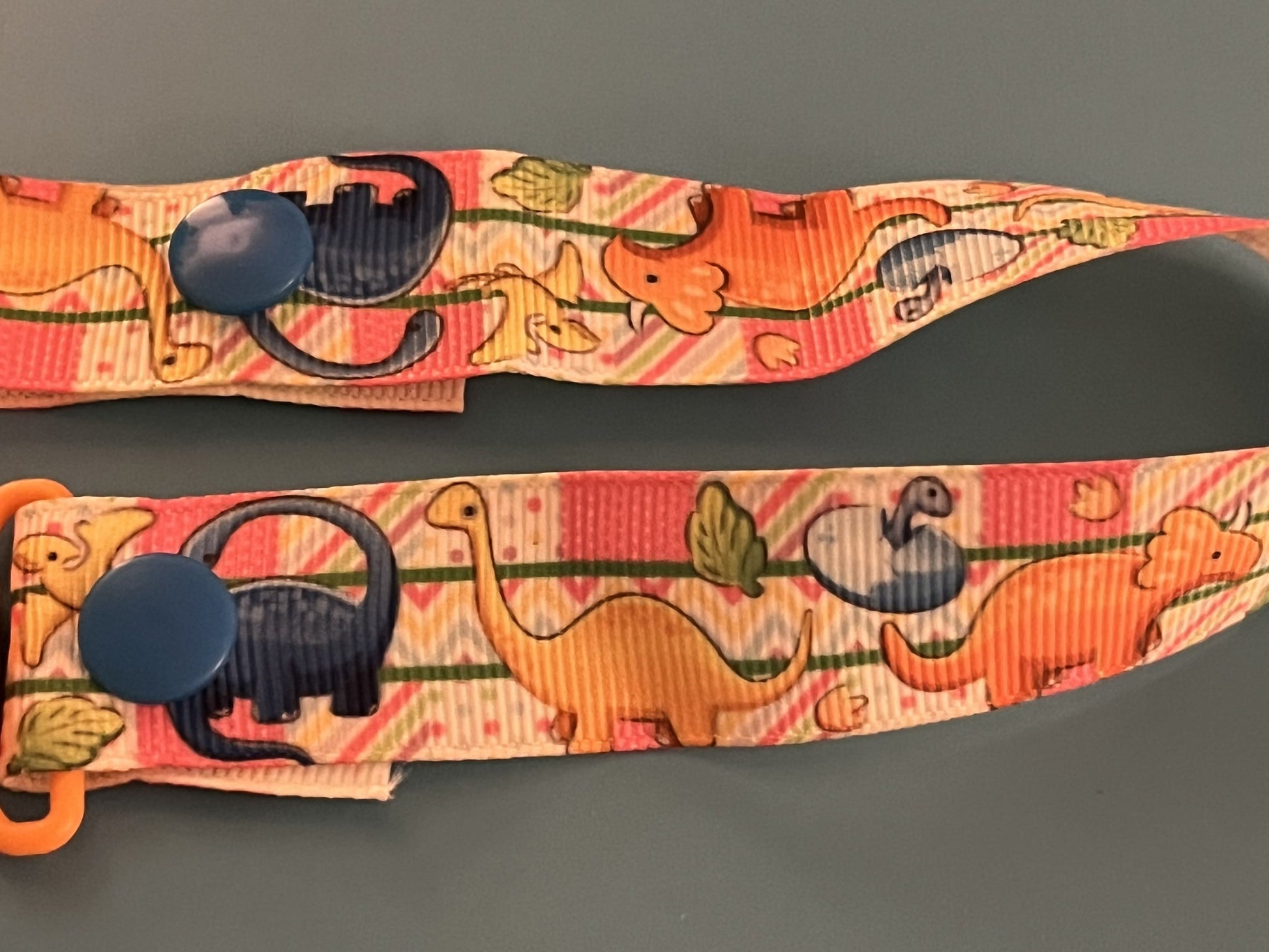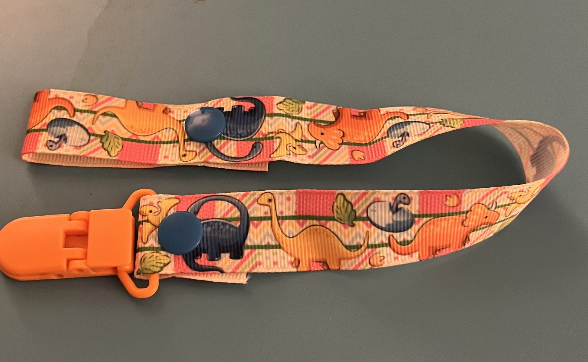 This is a pacifier clip made from grosgrain ribbon. It has a pattern of colorful dinosaurs. If you want the clip and/or snaps a certain color, please tell me, as they are usually chosen at random.