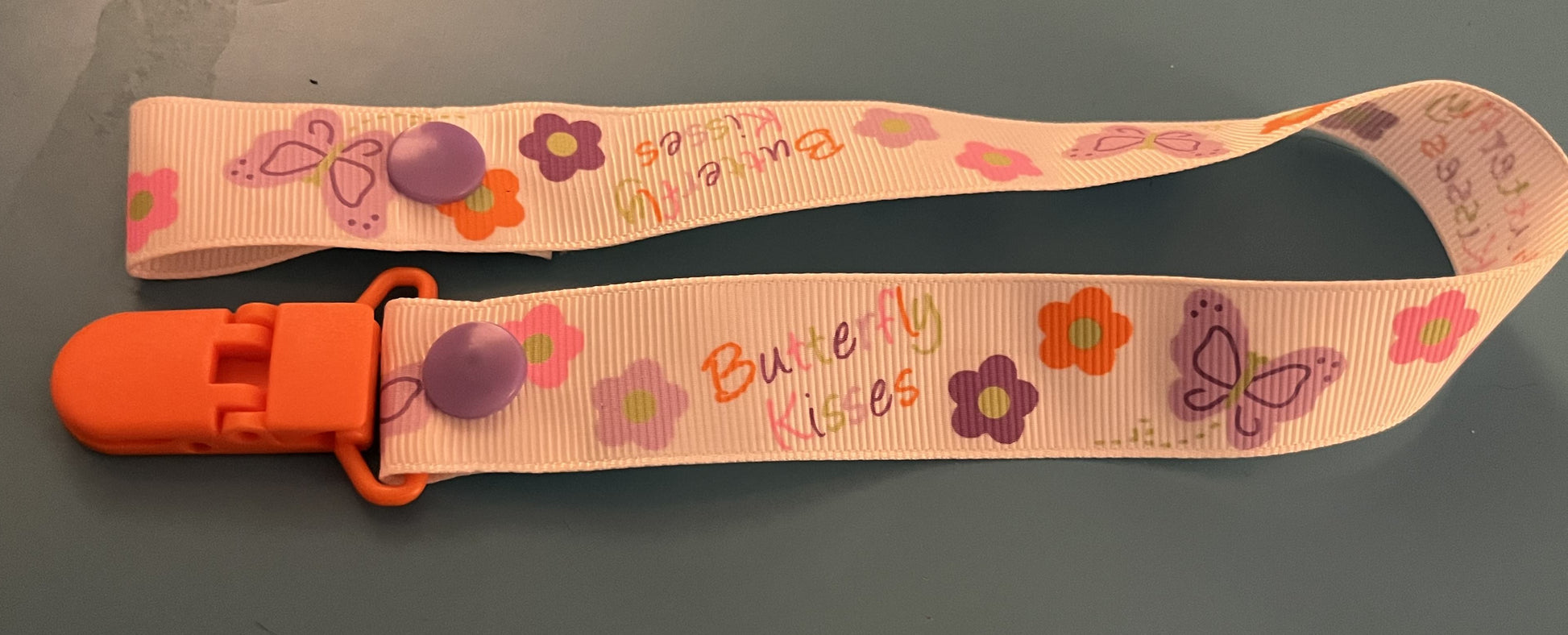 This is a pacifier clip made from grosgrain ribbon. It has a pattern of butterflies that says "Butterfly Kisses" on it. If you want the clip and/or snaps a certain color, please tell me, as they are usually chosen at random.