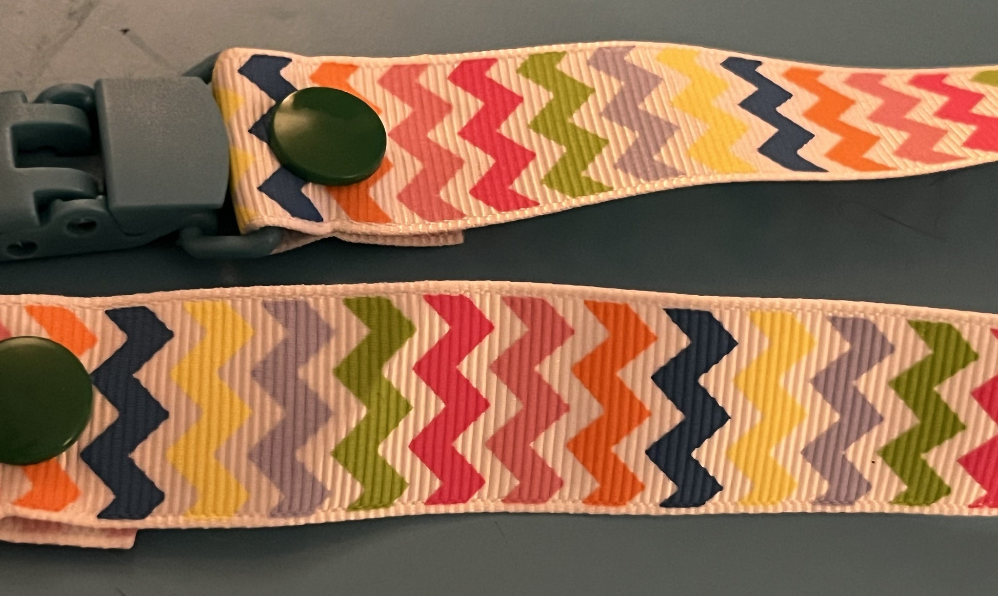 This is a pacifier clip made from grosgrain ribbon. It has a chevron pattern is different colors. If you want the clip and/or snaps a certain color, please tell me, as they are usually chosen at random.