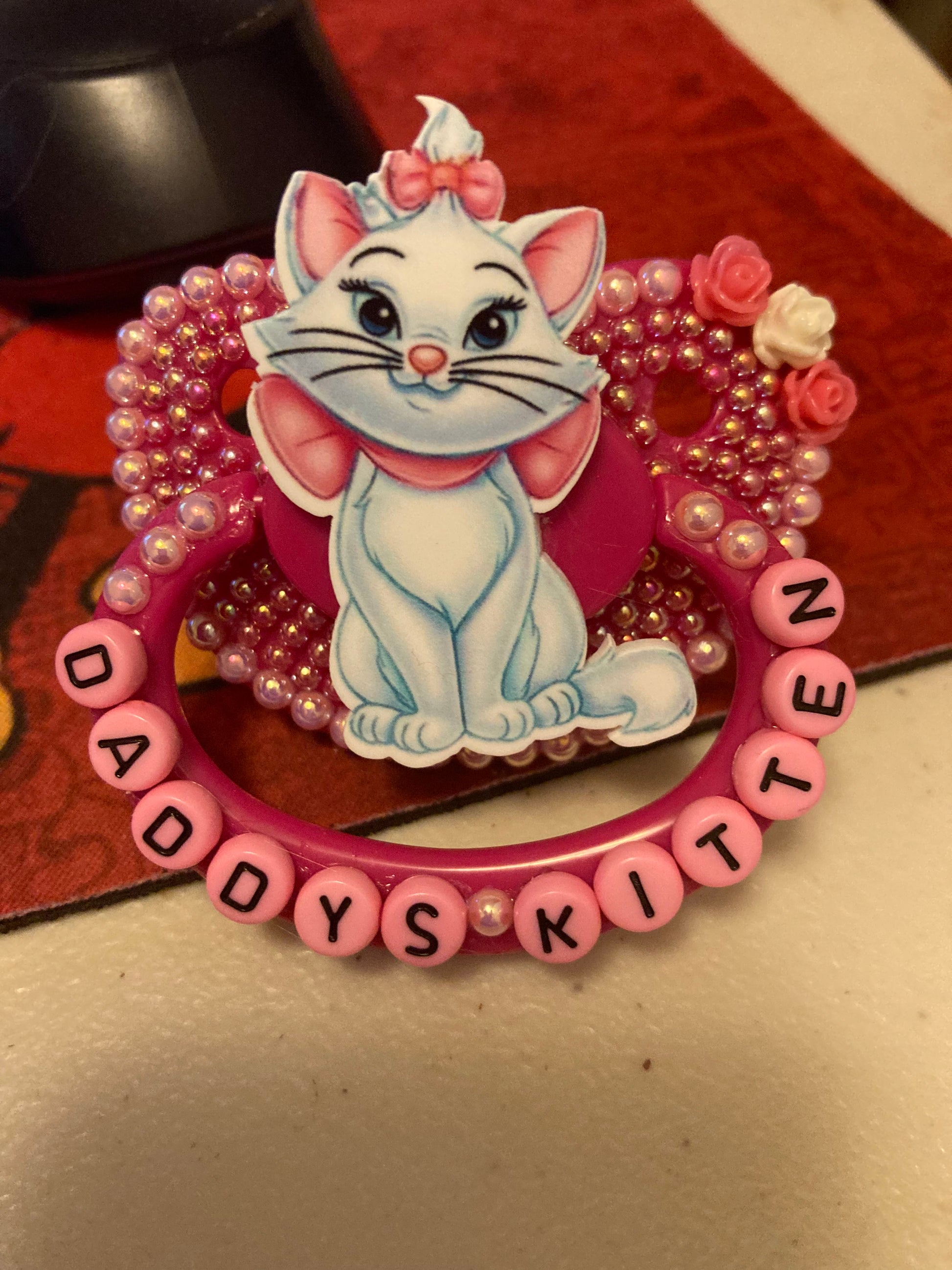 This is a dark pink adult pacifier with a kitten center. There are three roses on the right-hand corner of the shield and it's outlined in light pink pearls. The shield is covered with dark pink pearls and "Daddy's Kitten" is written on the handle in pink alpha beads. If you like this product but would like a variation, get in touch with me, as I'm willing to make something custom.