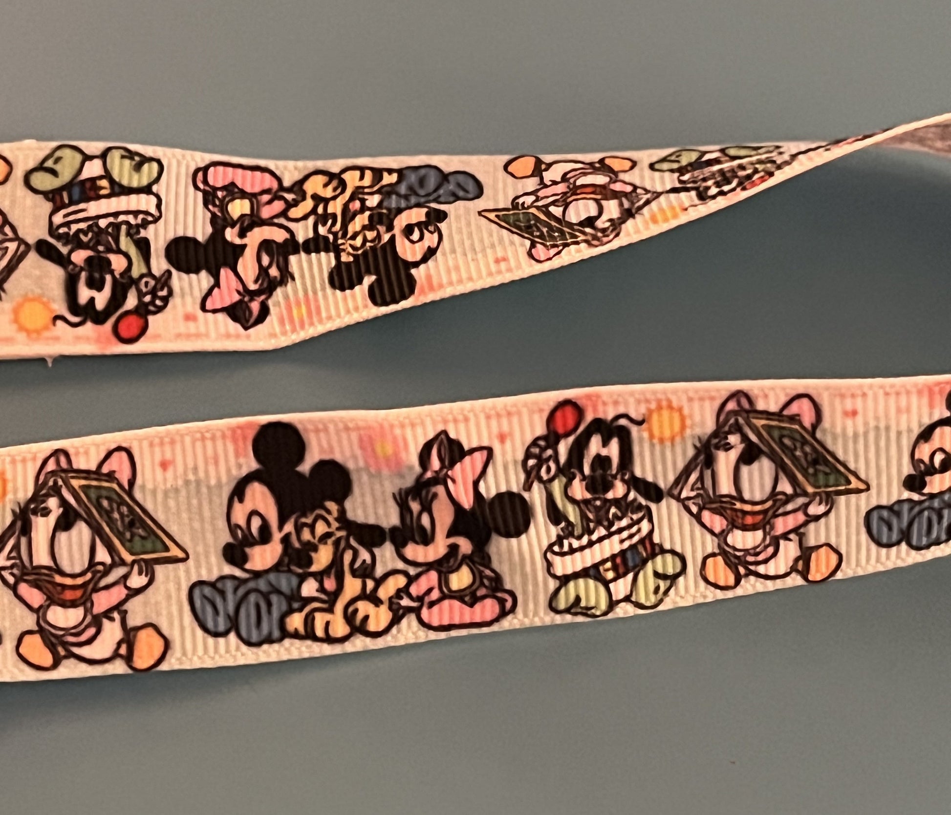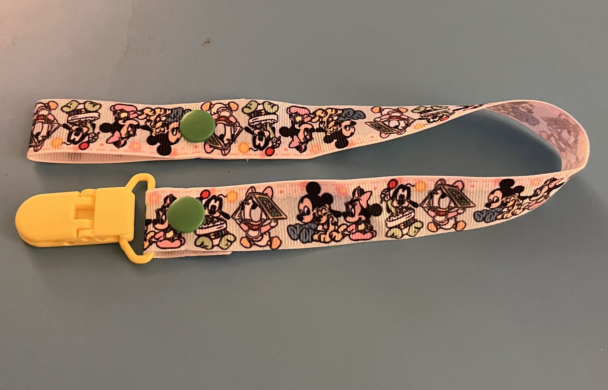 This is a pacifier clip made from grosgrain ribbon. It has a pattern of the Disney Babies. It has Baby Mickey, Baby Minnie, Baby Daisy, Baby Donald, and Pluto. If you want the clip and/or snaps a certain color, please tell me, as they are usually chosen at random.