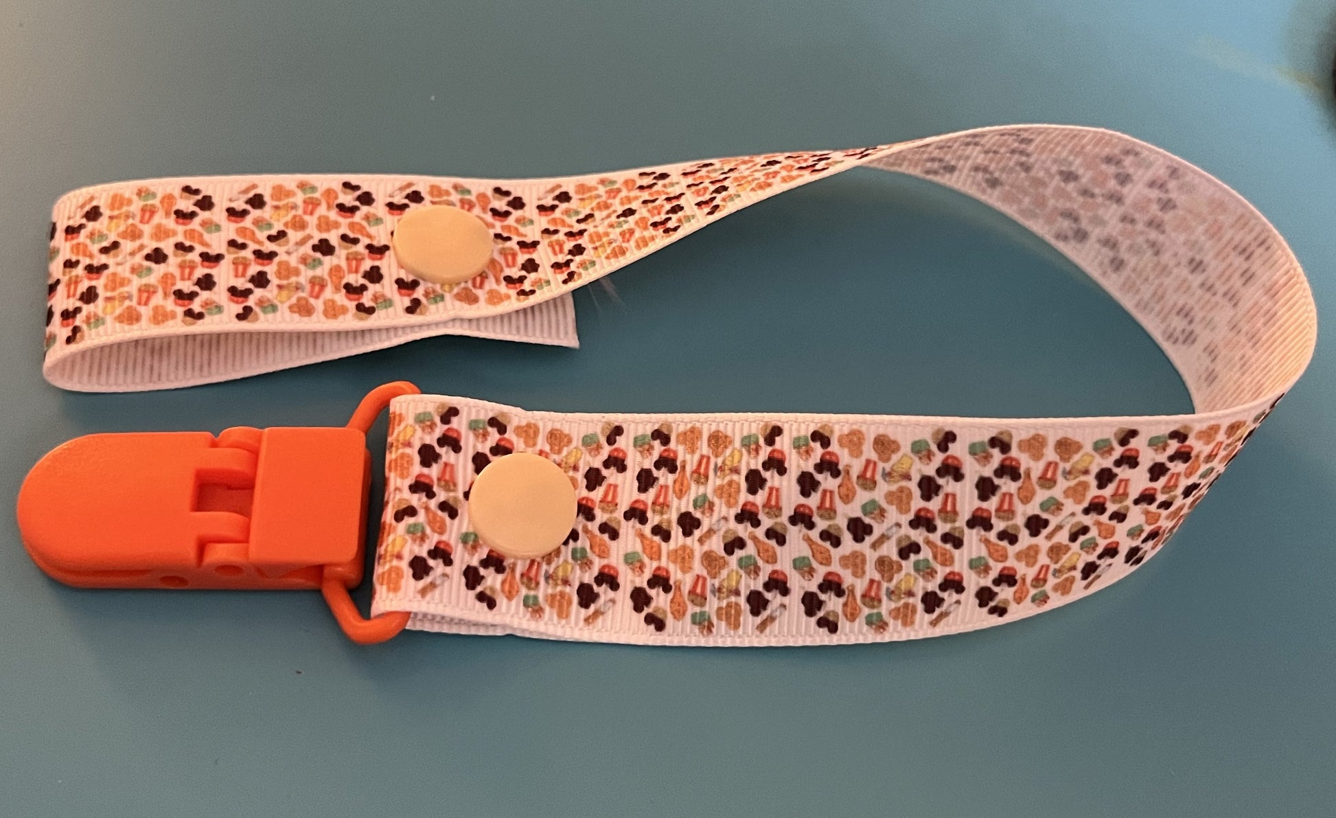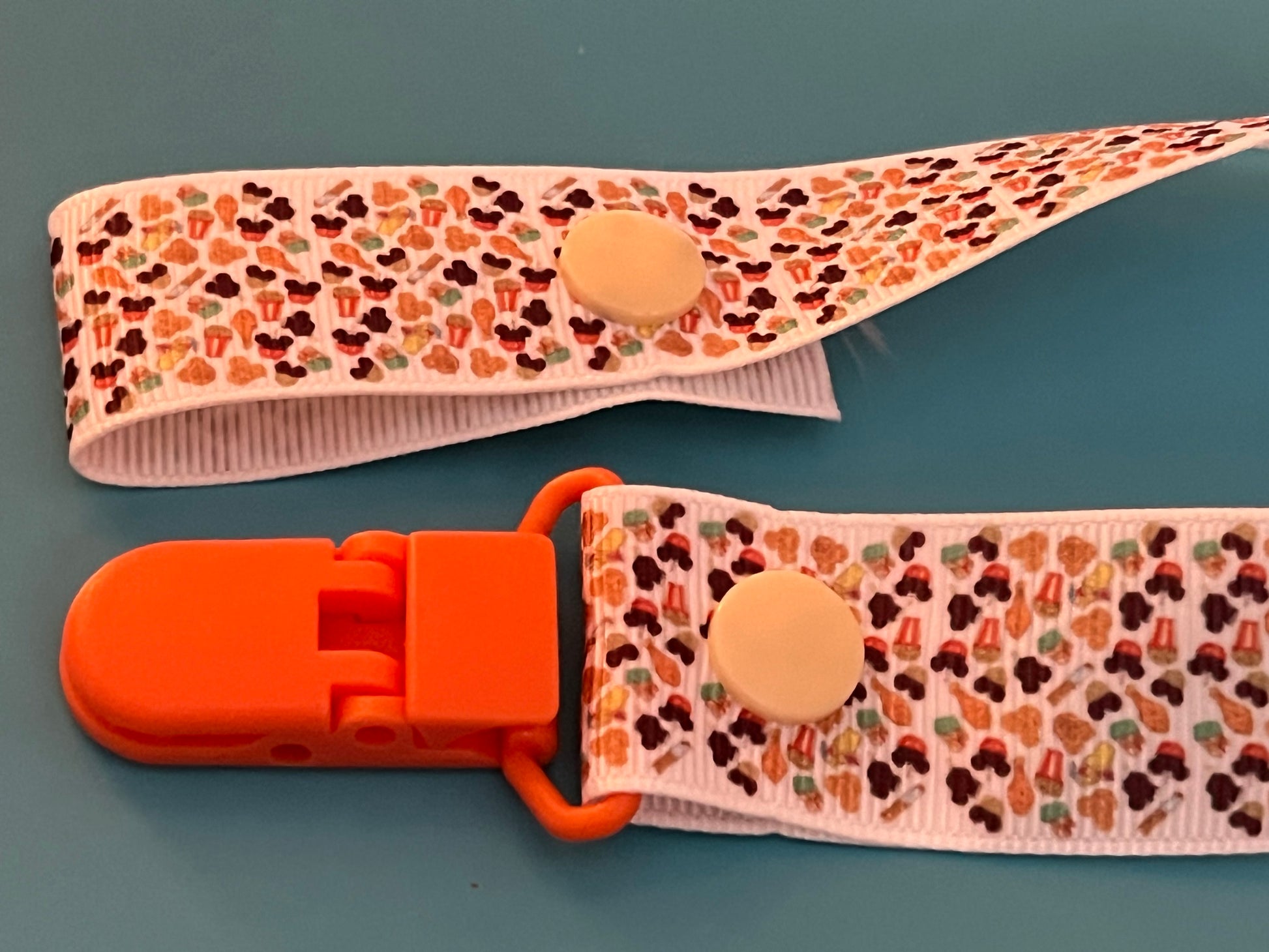 This is a pacifier clip made from grosgrain ribbon. It has a pattern of Disney themed treats. If you want the clip and/or snaps a certain color, please tell me, as they are usually chosen at random.
