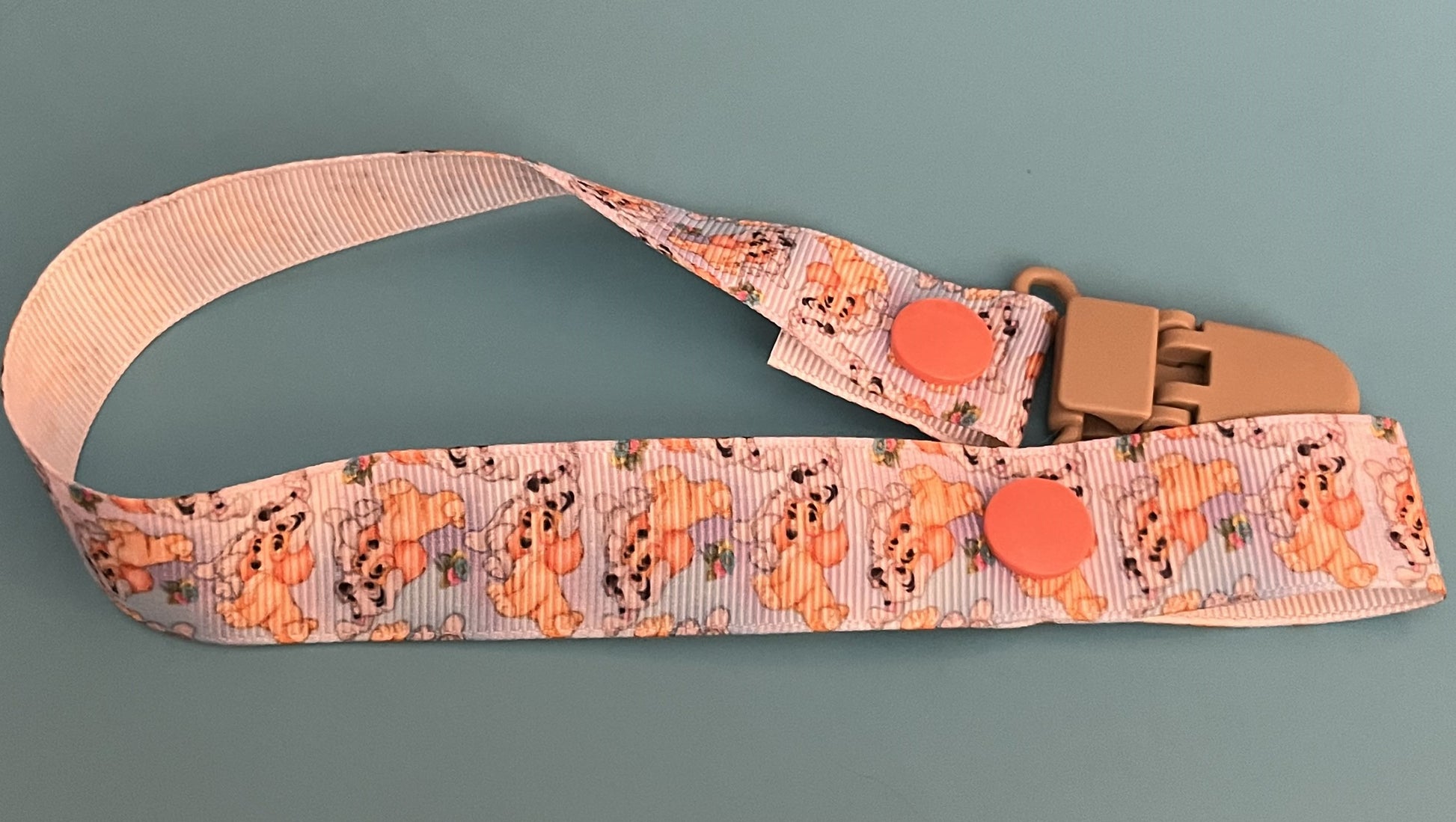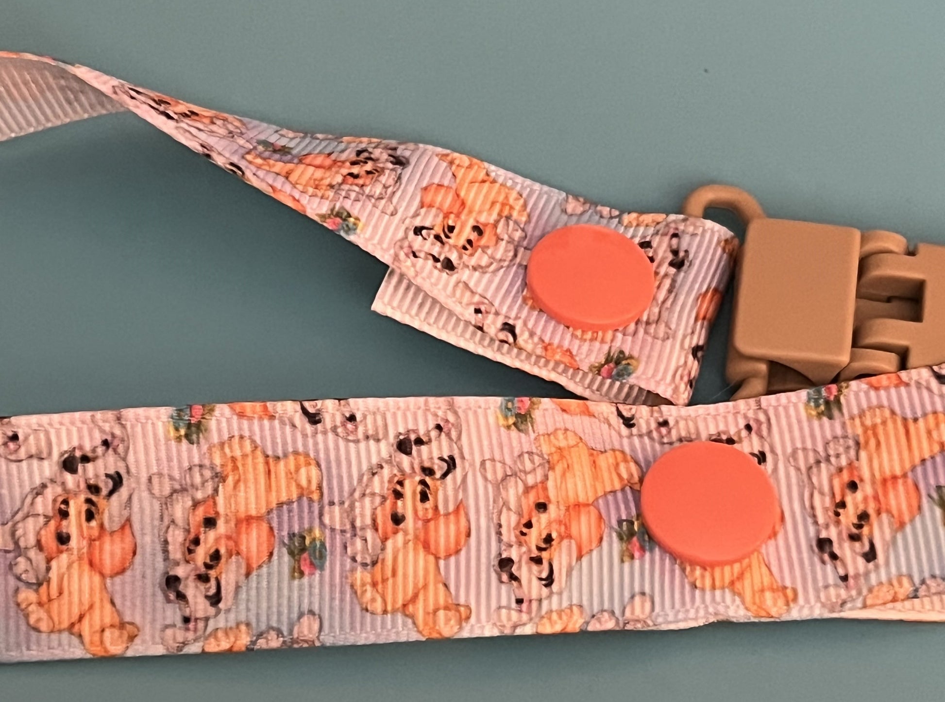This is a pacifier clip made from grosgrain ribbon. It has a pattern of the two dogs from Lady and the Tramp. If you want the clip and/or snaps a certain color, please tell me, as they are usually chosen at random.