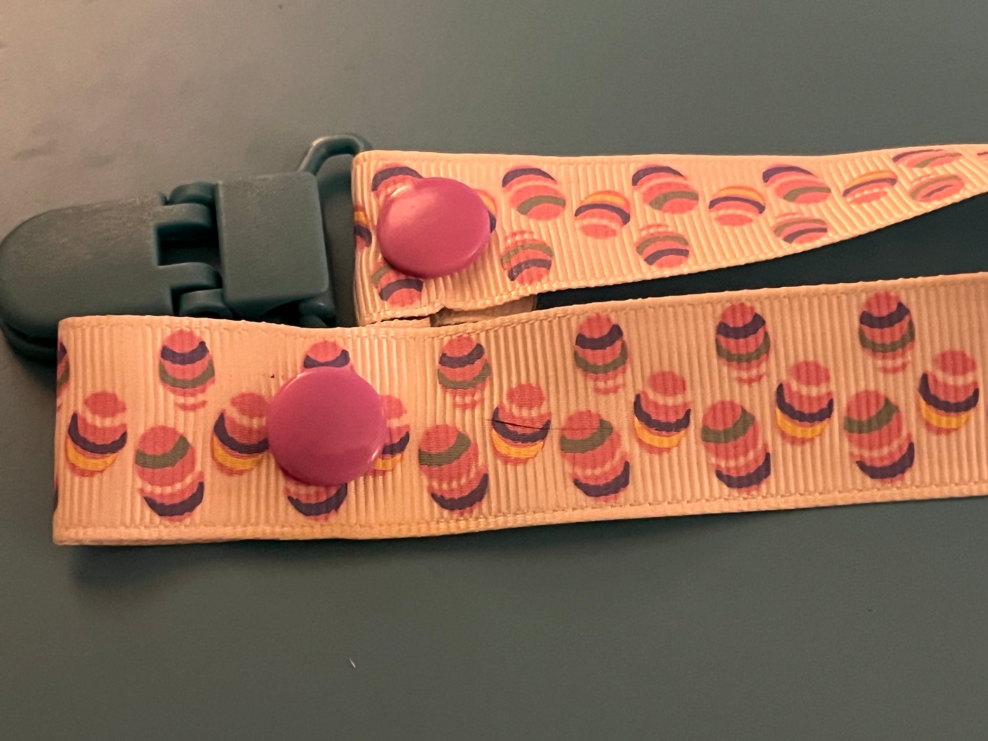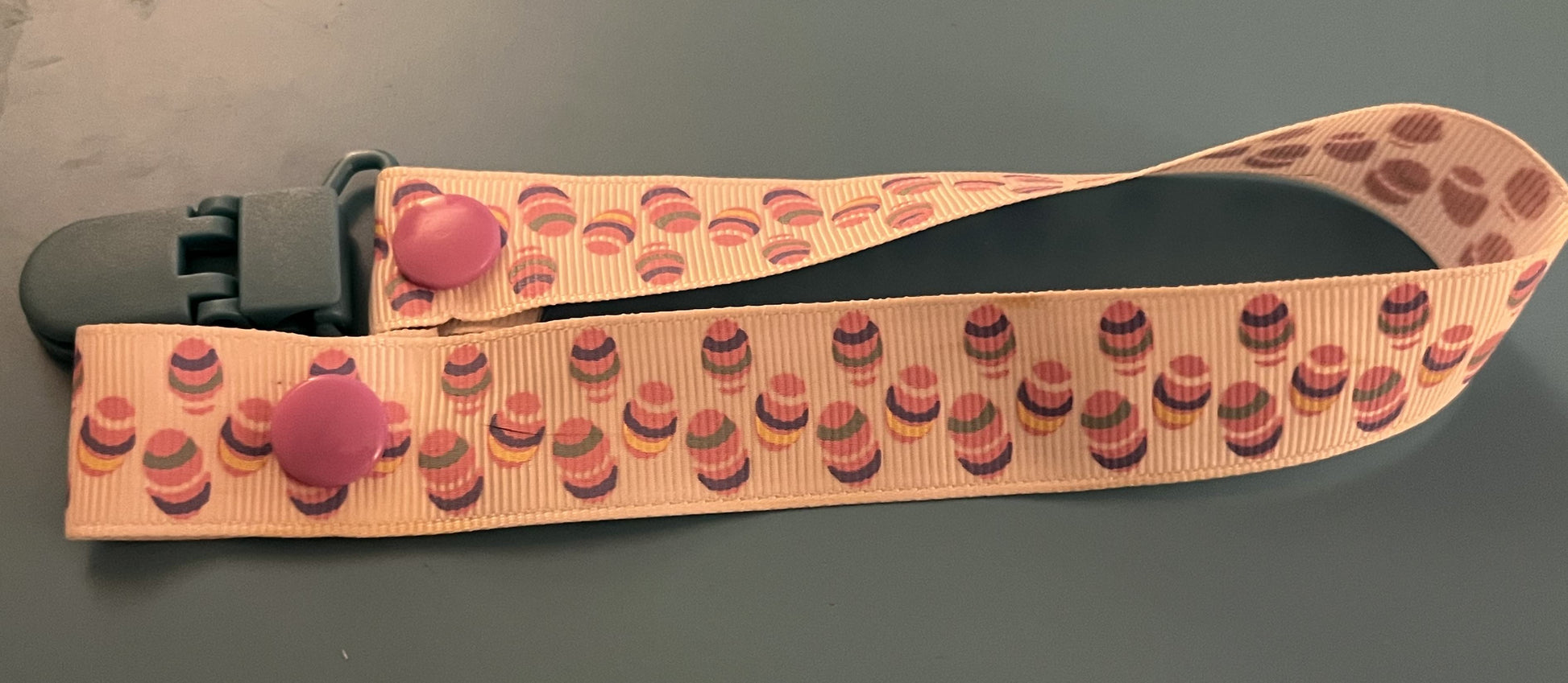 This is a pacifier clip made from grosgrain ribbon. It has a pattern of colorful Easter eggs. If you want the clip and/or snaps a certain color, please tell me, as they are usually chosen at random.