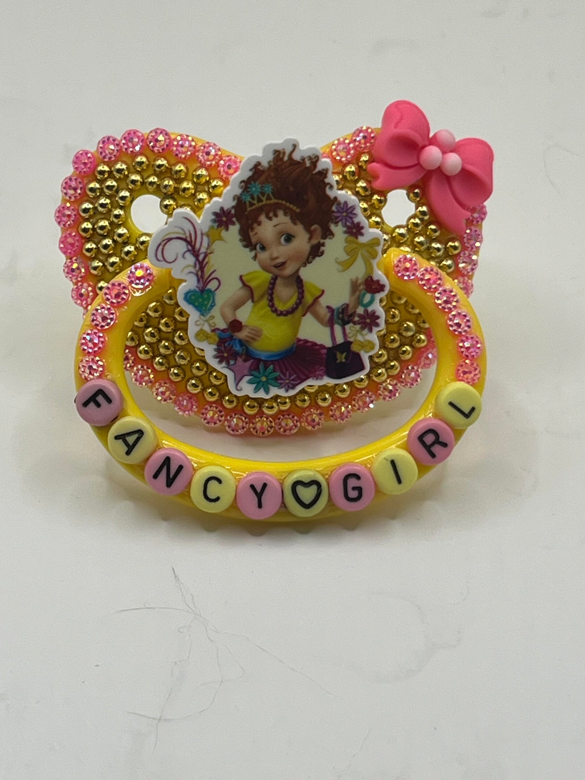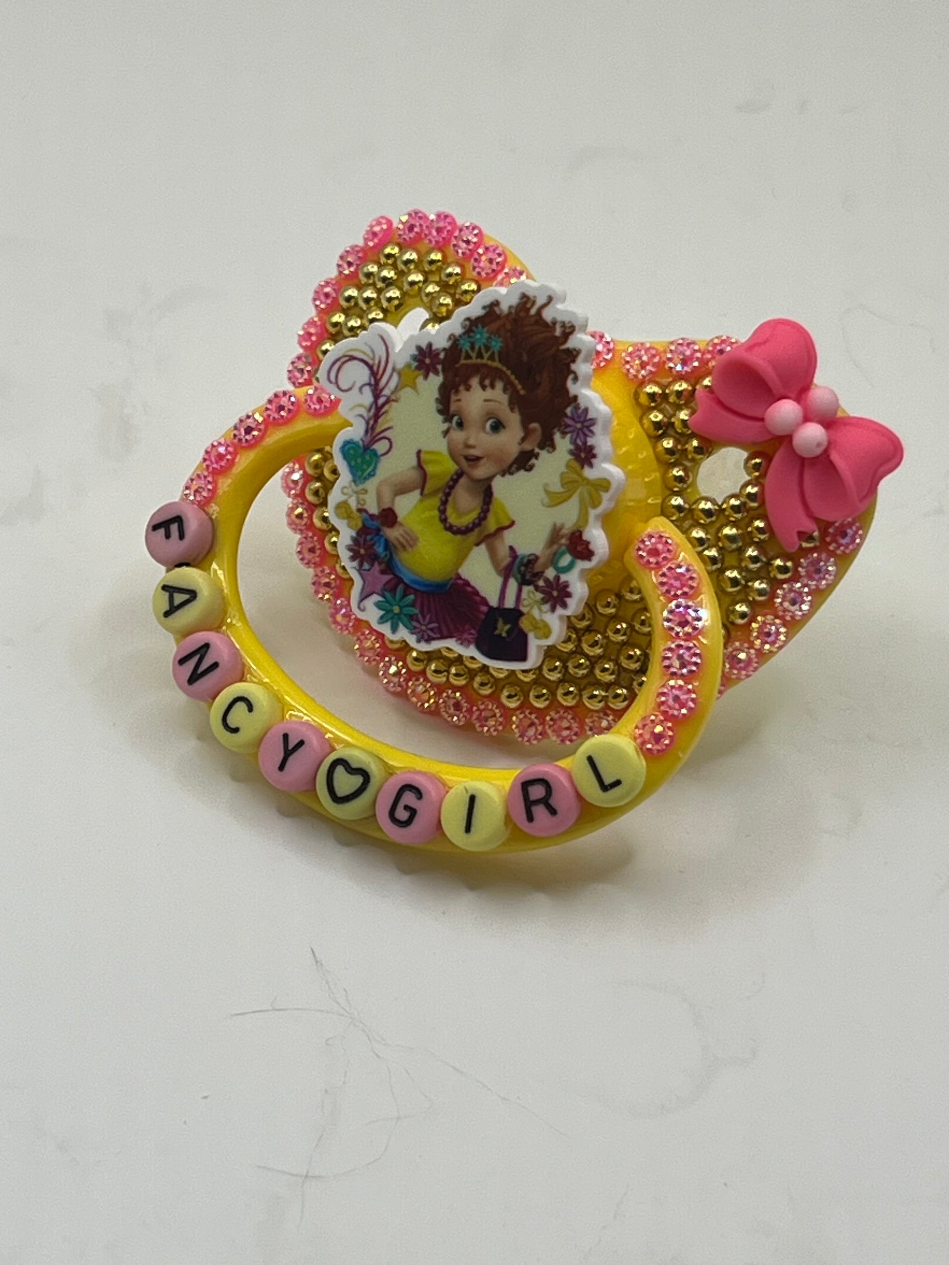 This is a yellow adult pacifier with a Fancy Girl center. There's a pink bow in the right-hand corner of the shield. It's outlined in pink sunflower rhinestones and covered in gold pearls. "Fancy Girl" is written on the handle in pink and yellow alpha beads.