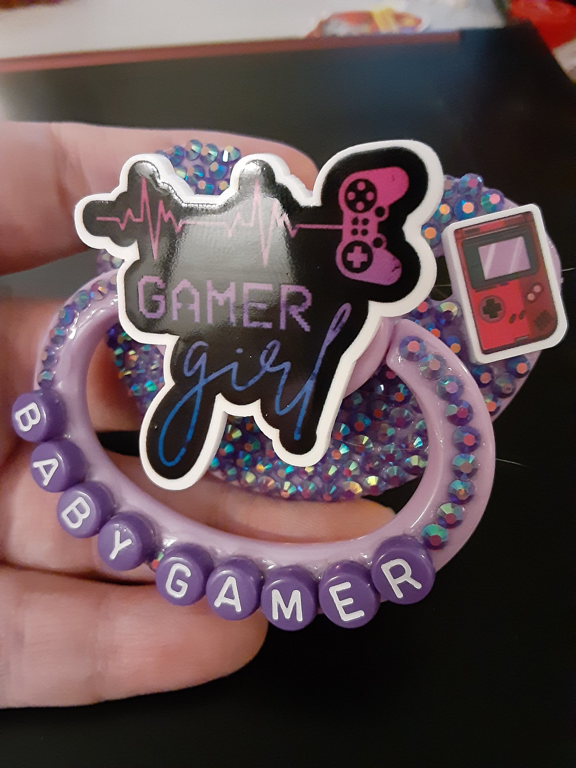 This is a lavender adult pacifier with a 'Gamer Girl' center. There's a embellishment of a Game Boy on the right hand side of the shidle and it's covered in purple jelly rhinestones. 'Baby Gamer' is written on the handle with dark purple alpha beads. If you like this product but would like a variation, get in touch with me, as I'm willing to make something custom.