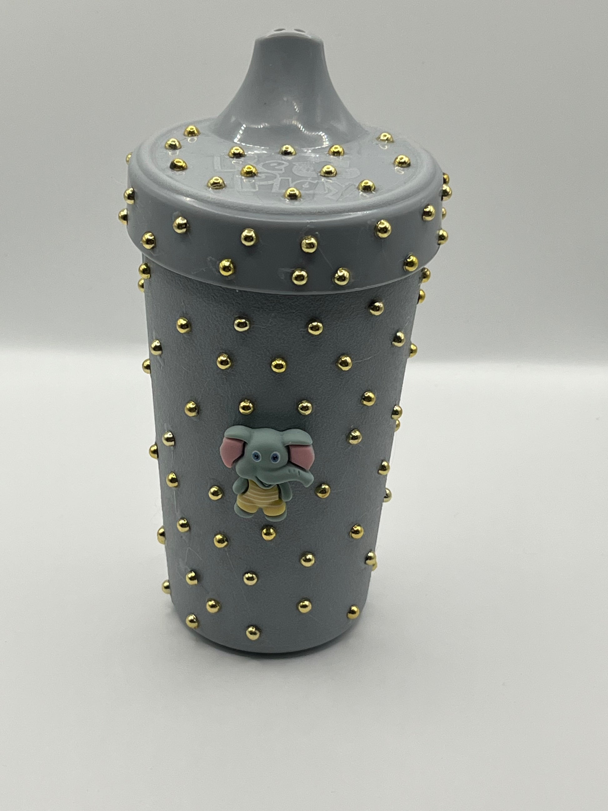This is a grey sippy cup with a center of an elephant. It is decorated with gold pearls. The cup holds 8oz and is spillproof.