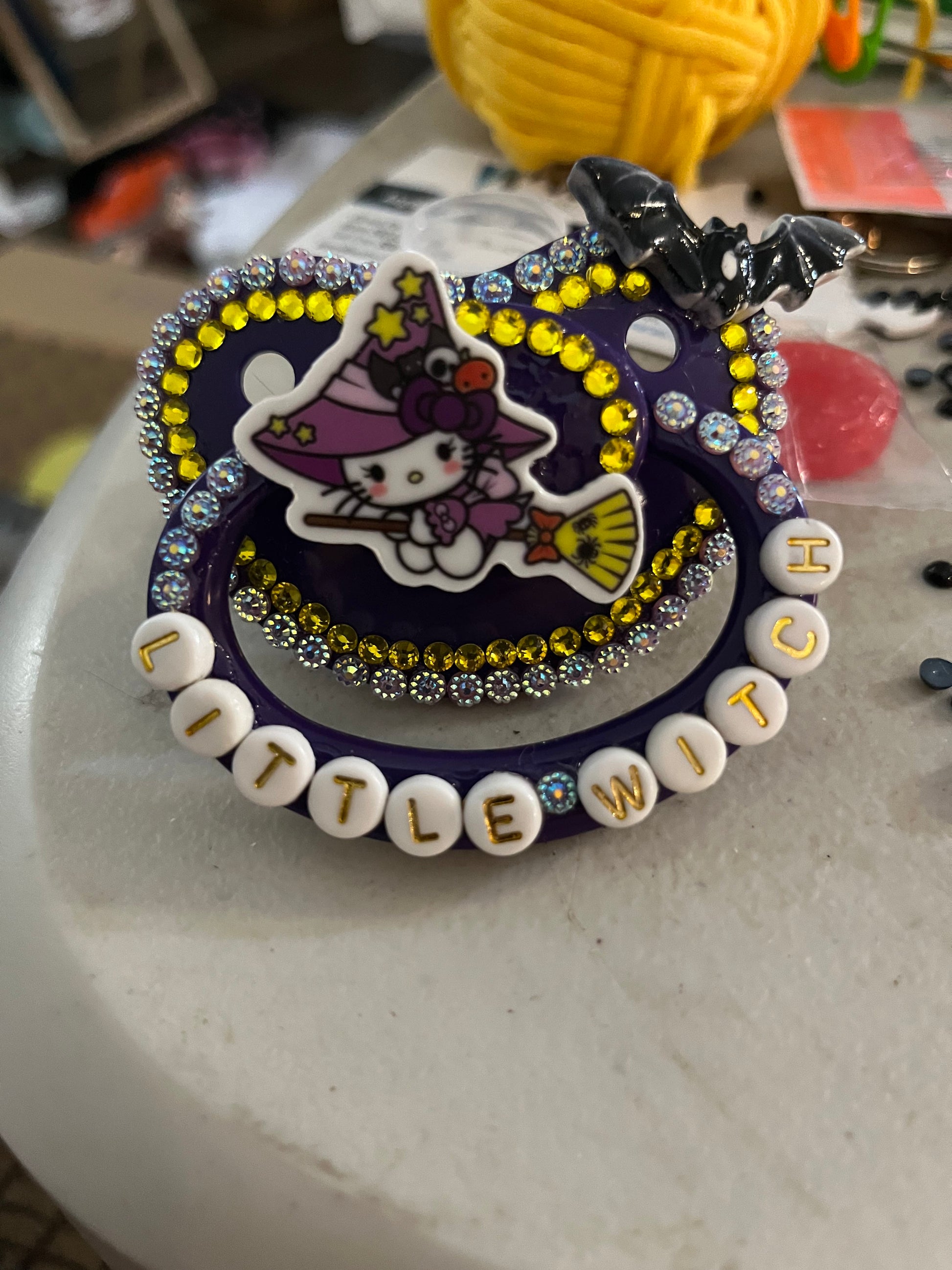 This is a dark purple adult pacifier with a Hello Kitty as a witch center. There's a bat on the right-hand corner of the shield and it's outlined in lavender sunflower rhinestones, and then another outline of yellow rhinestones. "Little Witch" is written on the handle in gold alpha beads. If you like this product but would like a variation, get in touch with me, as I'm willing to make something custom.