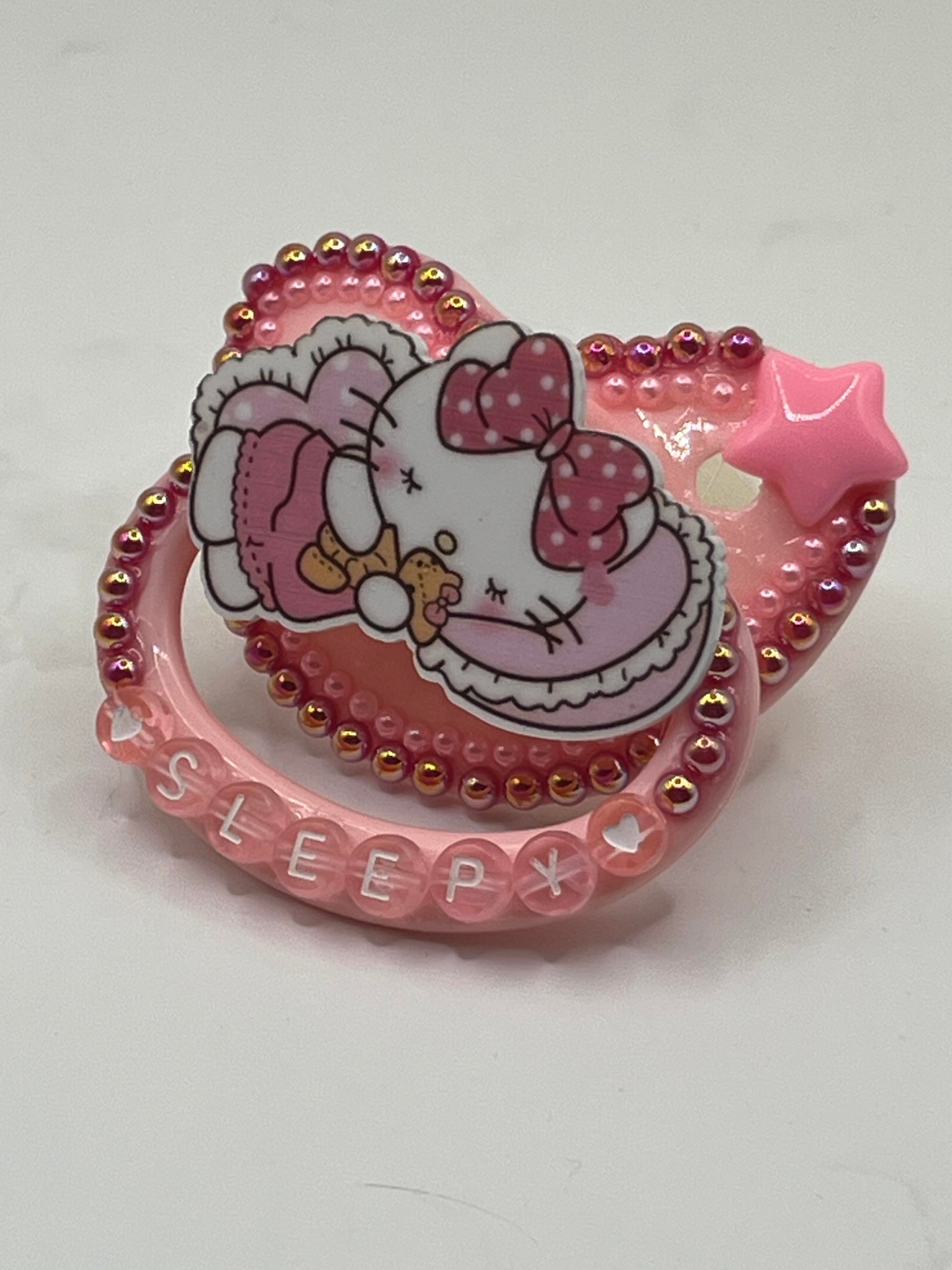 This is a light pink adult pacifier with a sleepy kitty center. There's a pink star in the right-hand corner of the shield. It's outlined once in dark pink pearls and then again in light pink ones. "Sleepy" is written on the handle in transparent pink alpha beads.