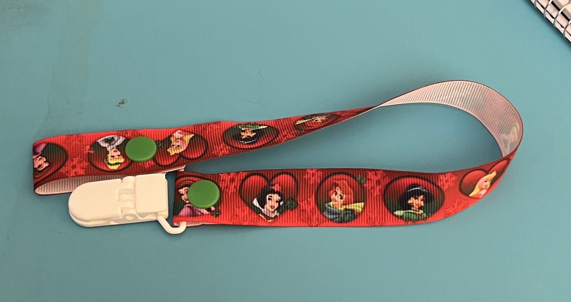 This is a pacifier clip made from grosgrain ribbon. It has a pattern of the Disney princesses in holiday outfits. The princesses included are Cinderella, Belle, Snow White, Jasmine, Ariel, and Aurora.