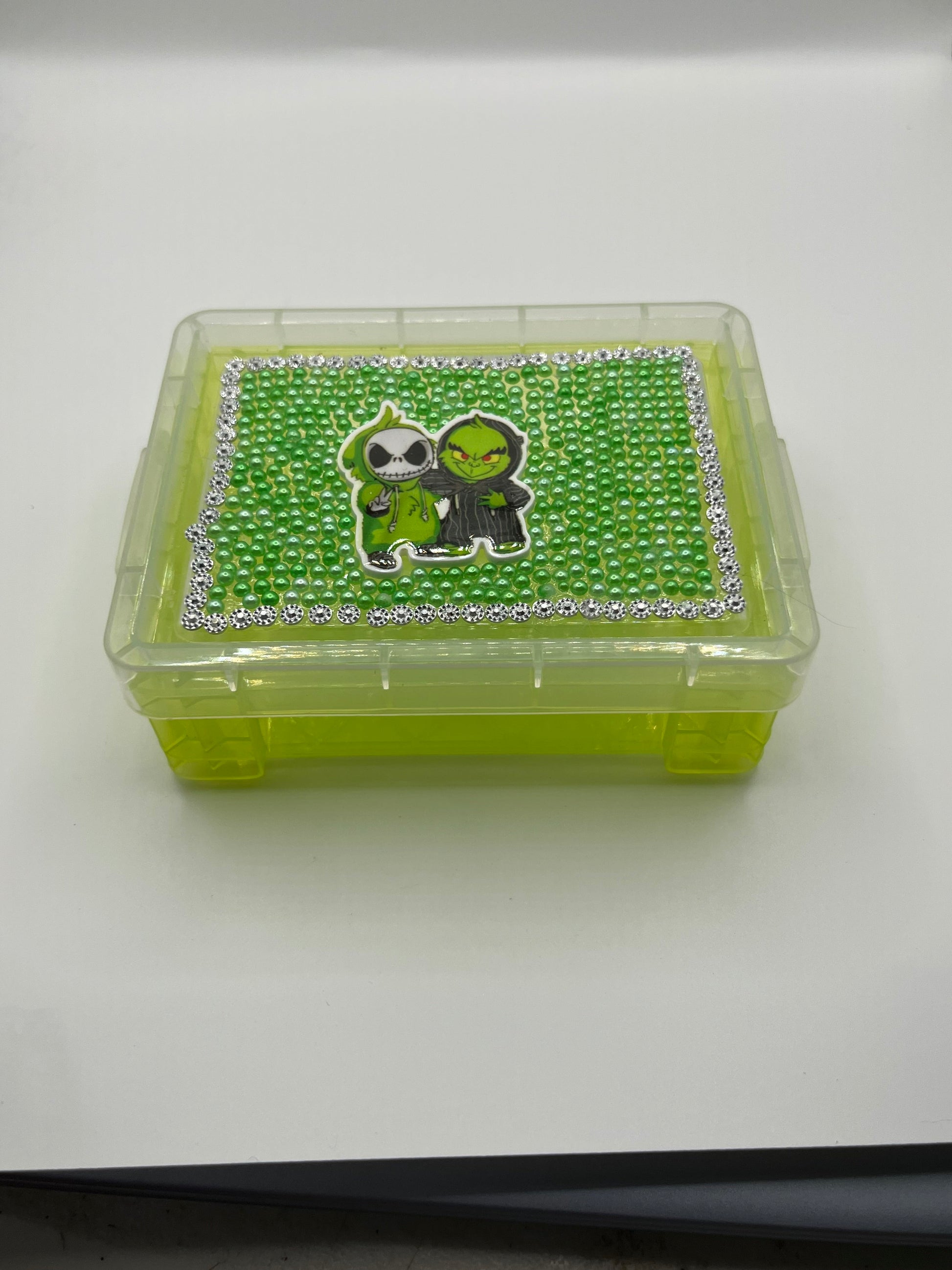 This is a green box that has a decorated lid. It has a center of Jack Skellington and the Grinch, and is covered in crystal sunflower rhinestones and green flatback pearls. The box holds a 24-pack of crayons easily, or can be used for other small things as well.