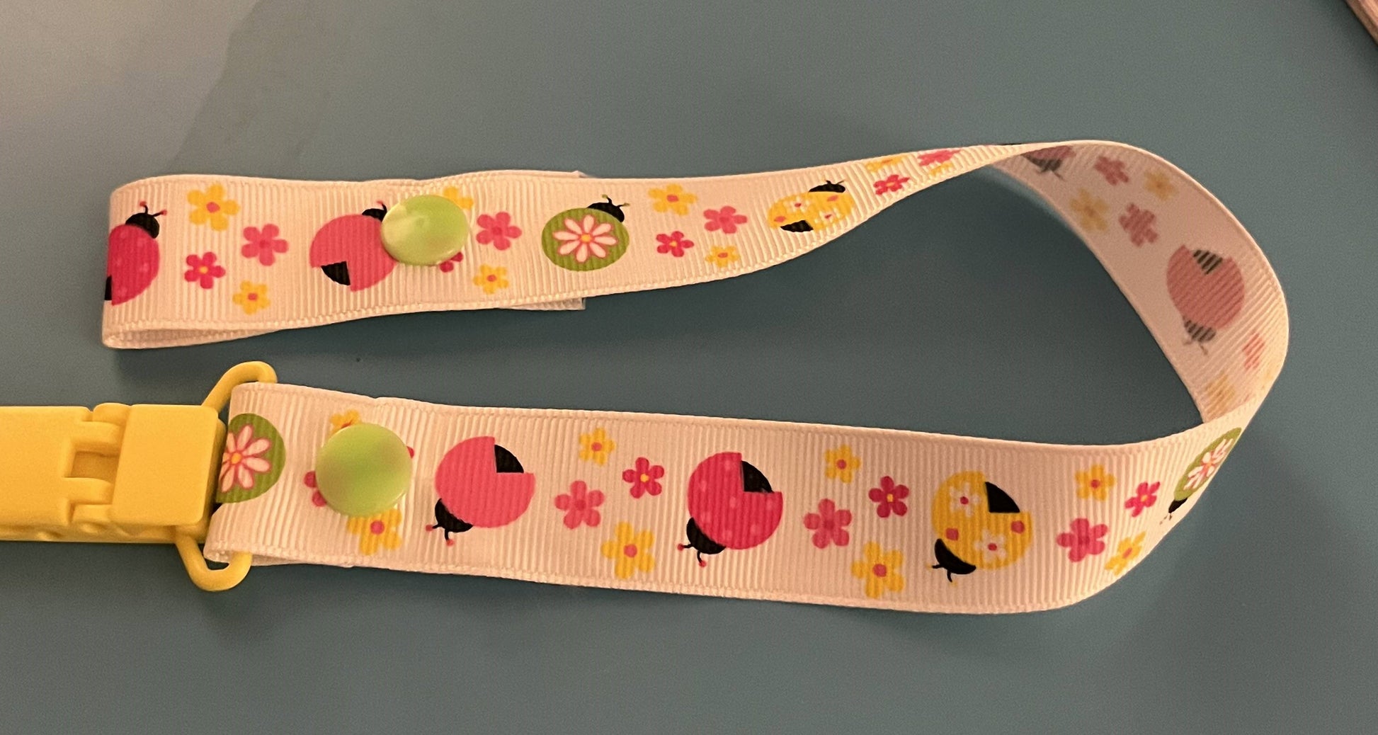 This is a pacifier clip made from grosgrain ribbon. It has a pattern of ladybugs and flowers. If you want the clip and/or snaps a certain color, please tell me, as they are usually chosen at random.