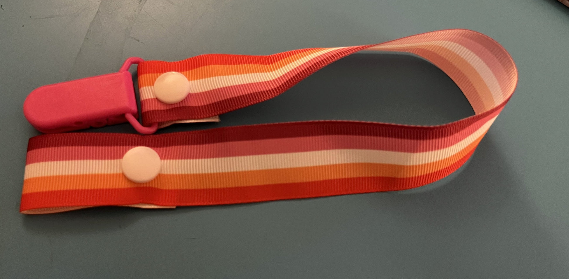 This is a pacifier clip made from grosgrain ribbon. It has a pattern of the lesbian pride flag. If you want the clip and/or snaps a certain color, please tell me, as they are usually chosen at random.