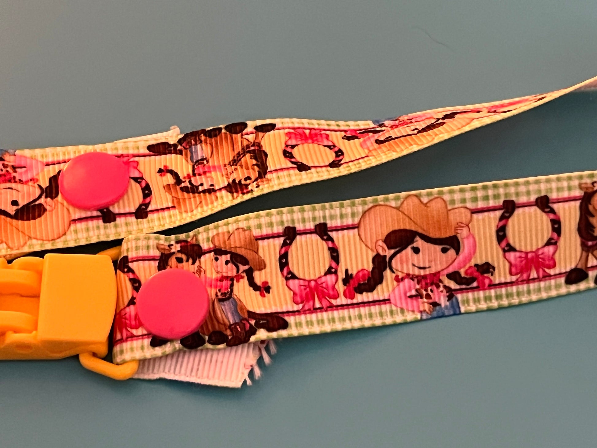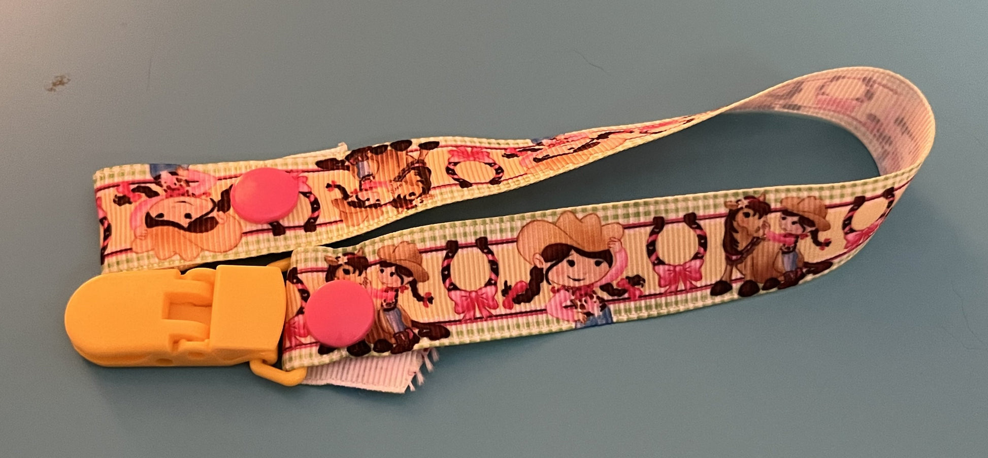 This is a pacifier clip made from grosgrain ribbon. It has a lil cowgirl pattern. If you want the clip and/or snaps a certain color, please tell me, as they are usually chosen at random.
