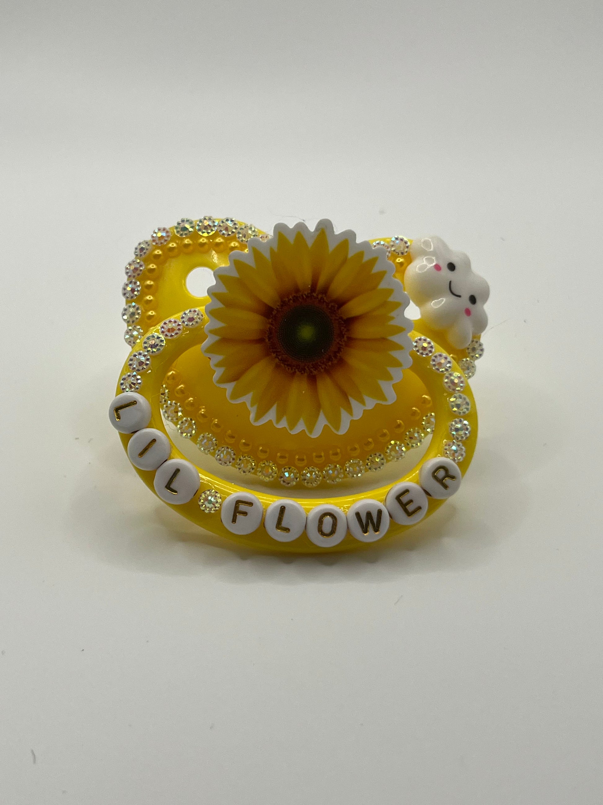 This is a sippy cup and adult pacifier set. The sippy cup is covered in yellow and crystal sunflower rhinestones and has a sunflower center. It holds 8 oz and is both spillproof and leakproof. Please note that the cup is NOT dishwasher safe. The pacifier is yellow and hsa a sunflower center. It has a cloud in the right-hand corner of the shield and is outlined once with crystal sunflower rhinestones and then again with white pearls. "Lil Flower" is written on the handle with black and white alpha beads.