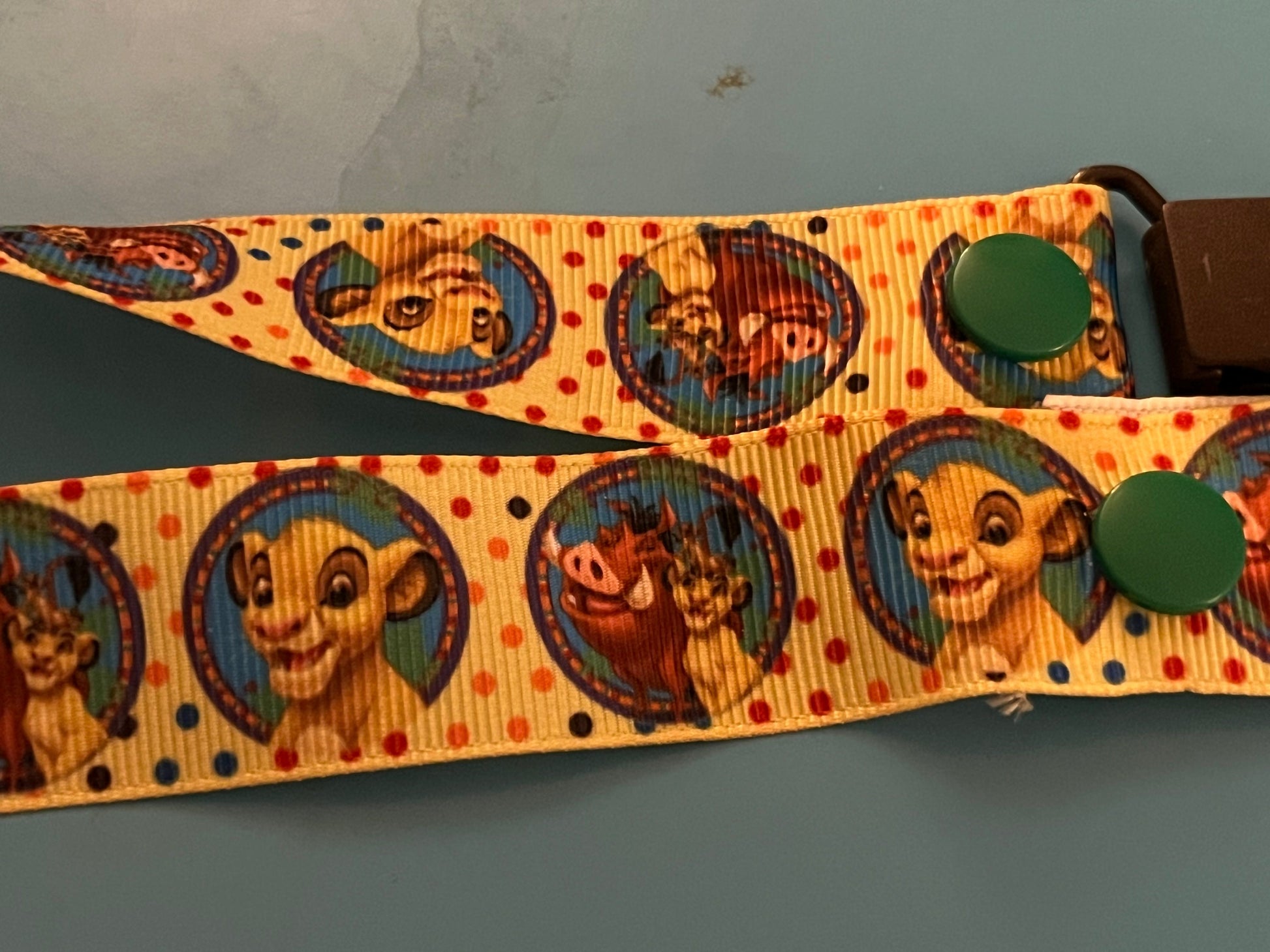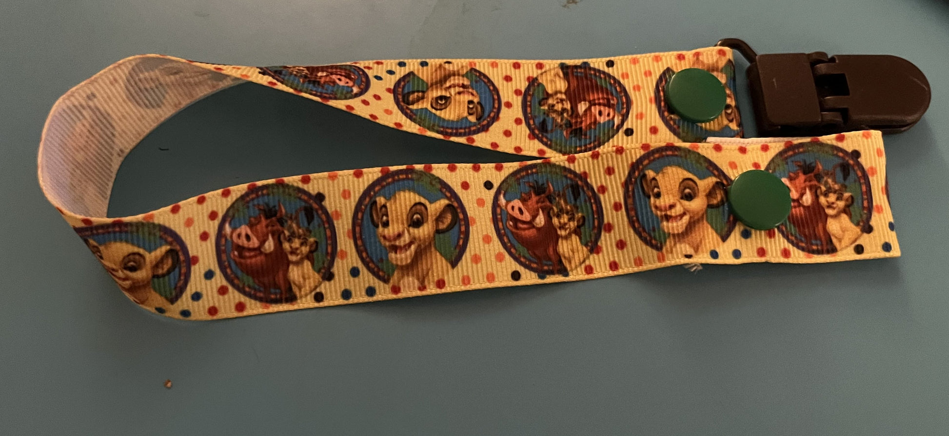This is a pacifier clip made from grosgrain ribbon. It has a pattern of the characters from The Lion King. If you want the clip and/or snaps a certain color, please tell me, as they are usually chosen at random.