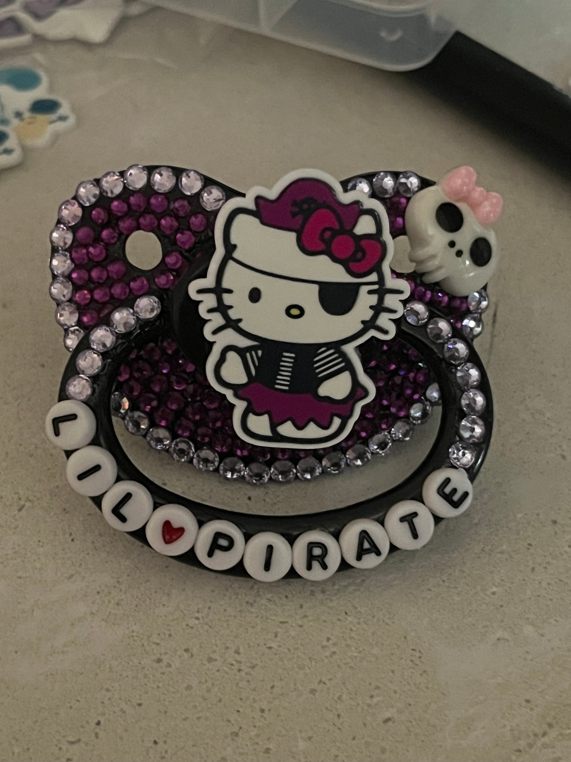 This is a black adult pacifier with a skull on the right-hand corner of the shield. It has a pirate kitty center and it oulined in lavender rhinestones. It is covered in dark purple rhinetones and says "Lil Pirate" on the shield in black and white alpha beads.