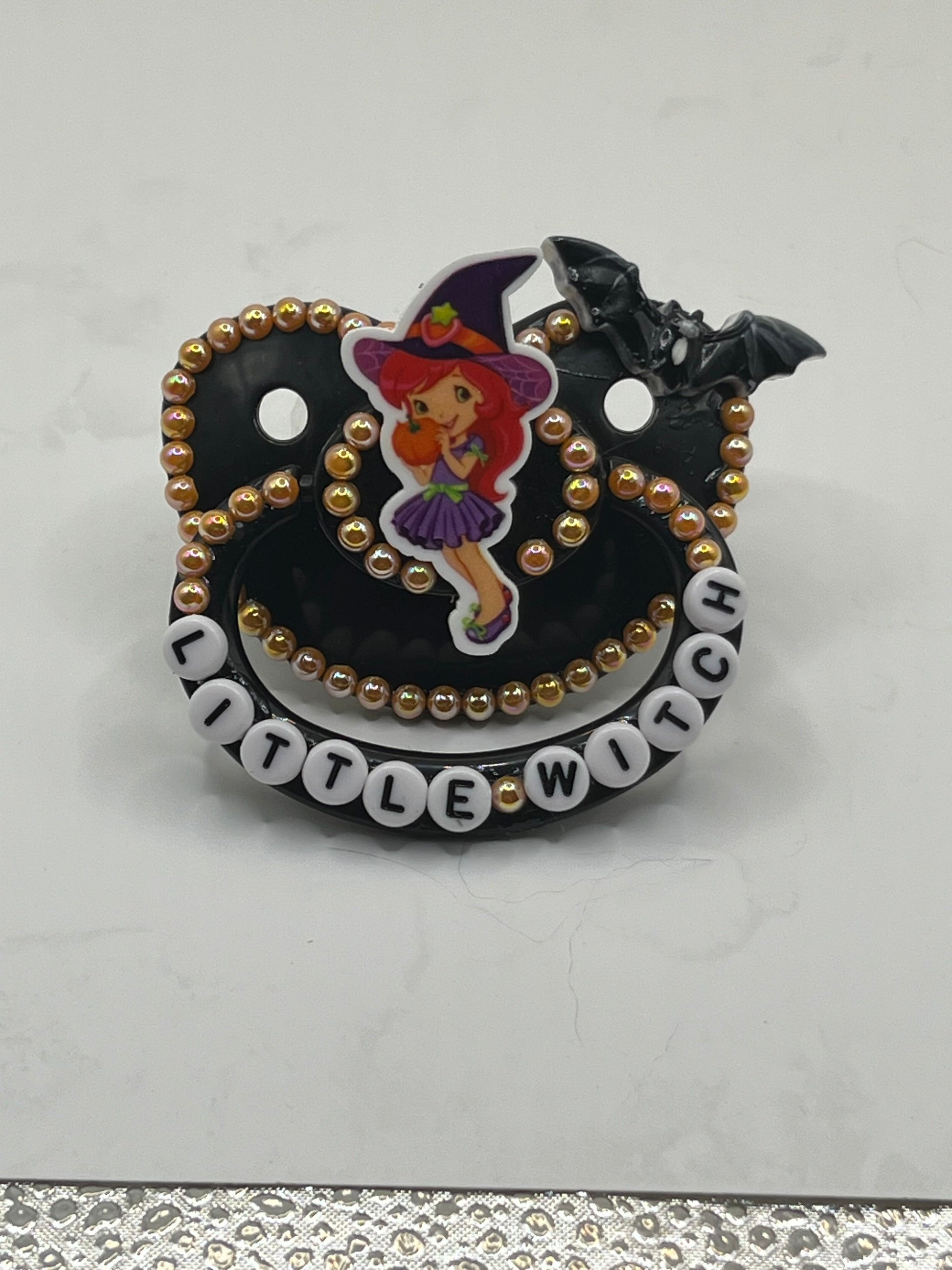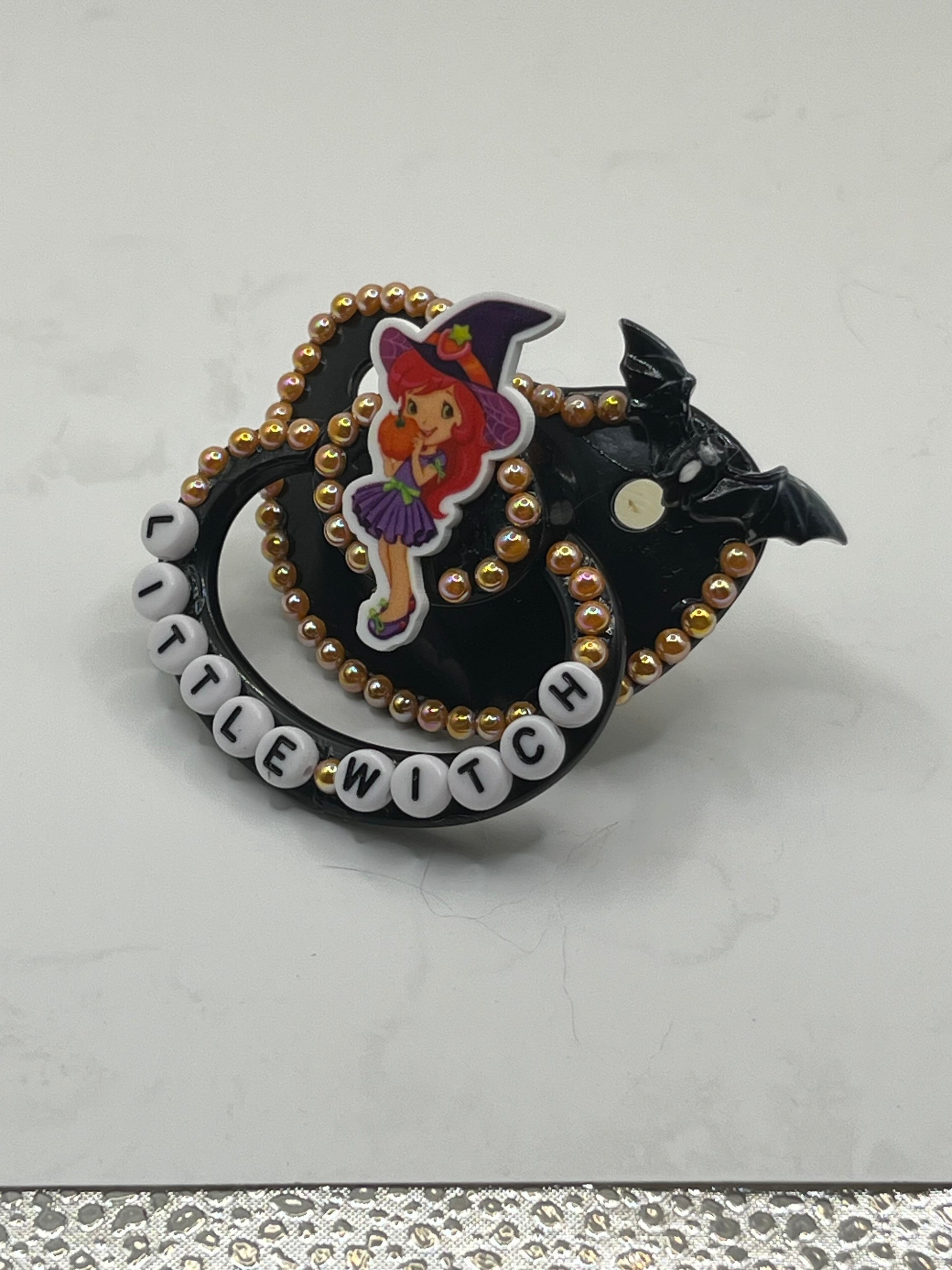 This is a black adult pacifier with a witchy girl center. There's a bat on the right-hand corner of the shield. It's outlined in yellow pearls and "Little Witch" is written on the handle in alpha beads.