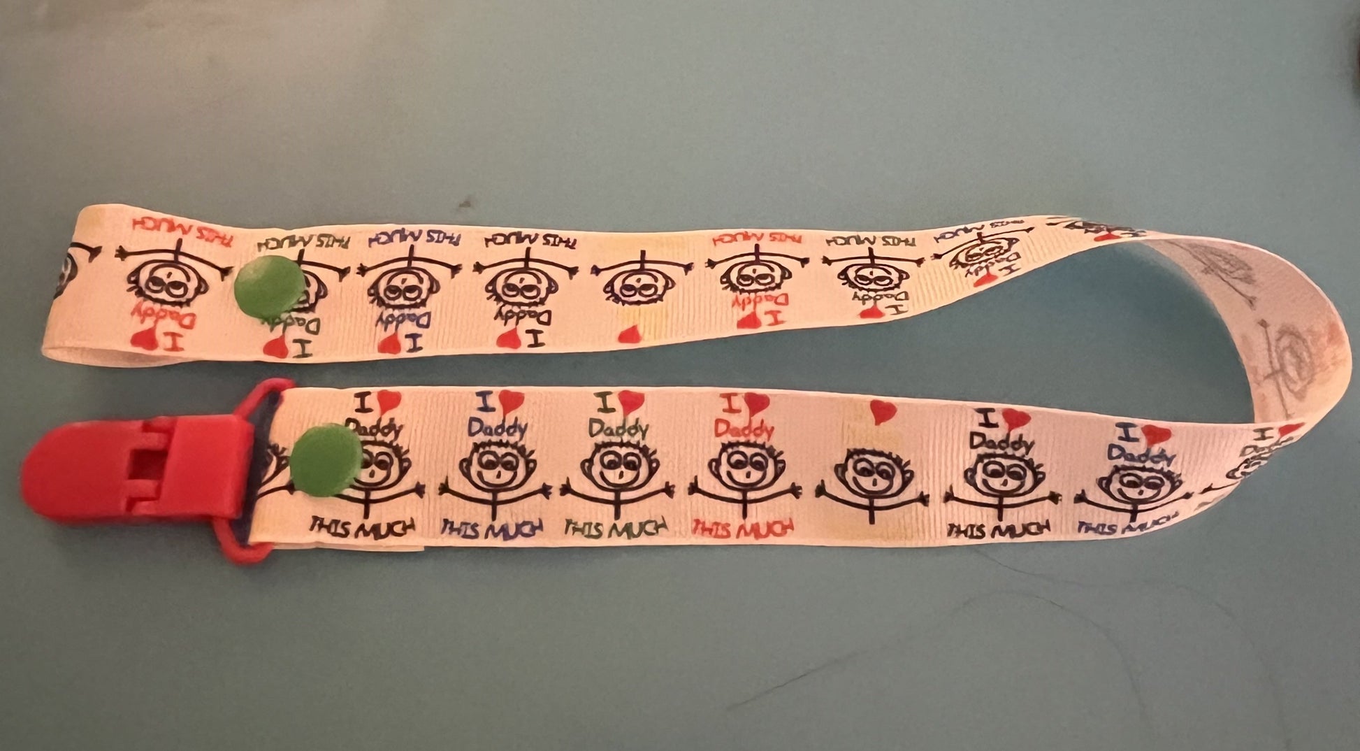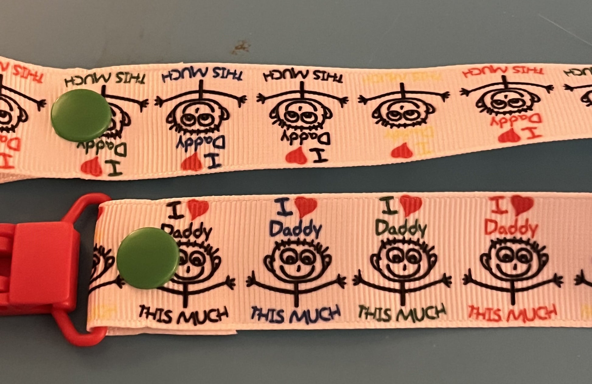 This is a pacifier clip made from grosgrain ribbon. It has a pattern of stick figures with text that says, "I love Daddy this much." If you want the clip and/or snaps a certain color, please tell me, as they are usually chosen at random.
