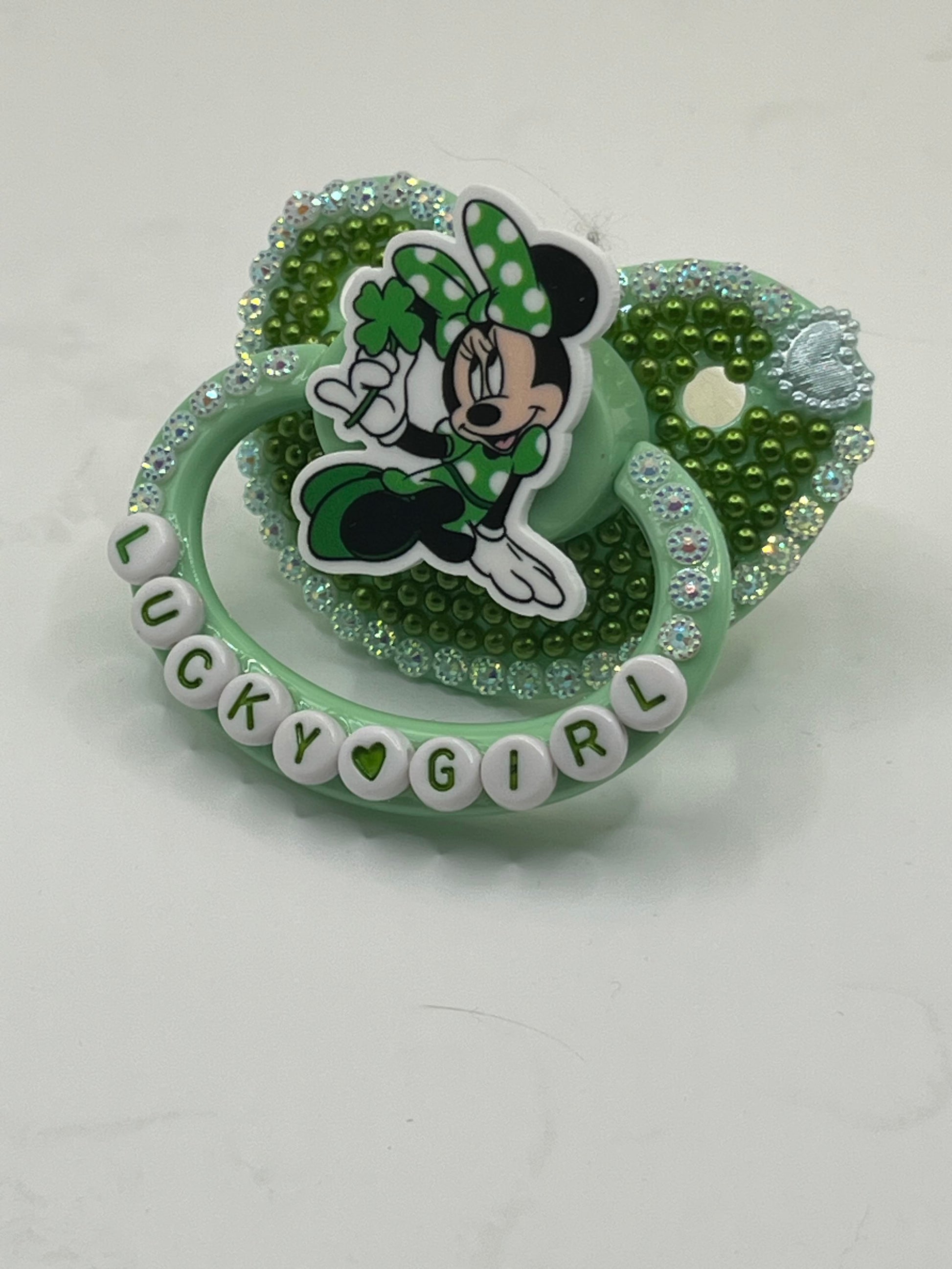 This is a light green adult pacifier with a Minnie Mouse center. There's a white heart on the right-hand corner of the shield. The pacifier is outlined in crystal sunflower rhinestones and then covered in green pearls. "Lucky Girl" is written on the handle in green alpha beads.