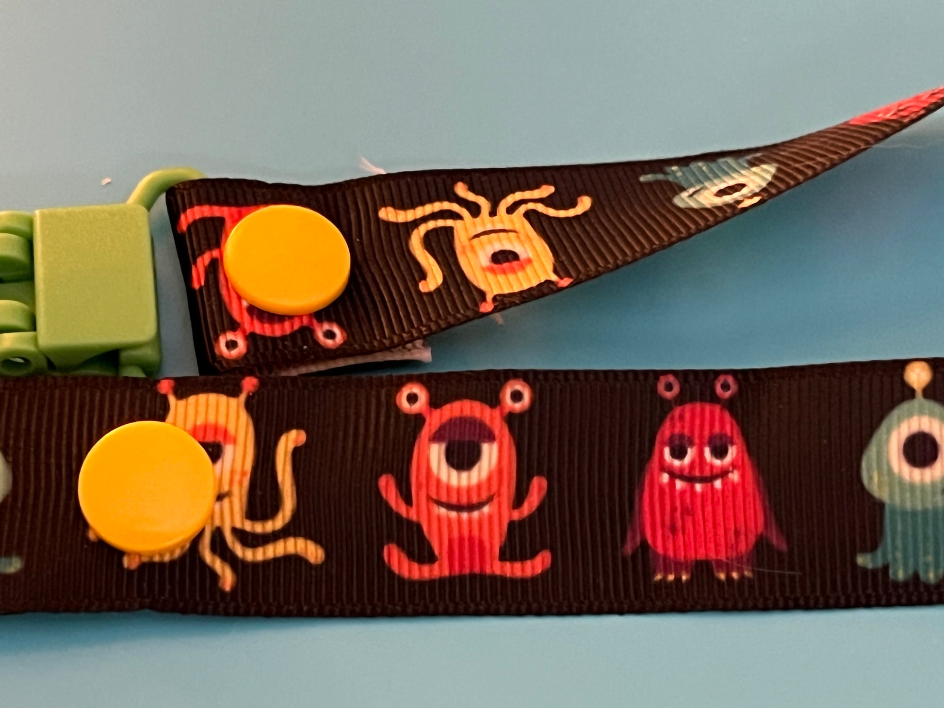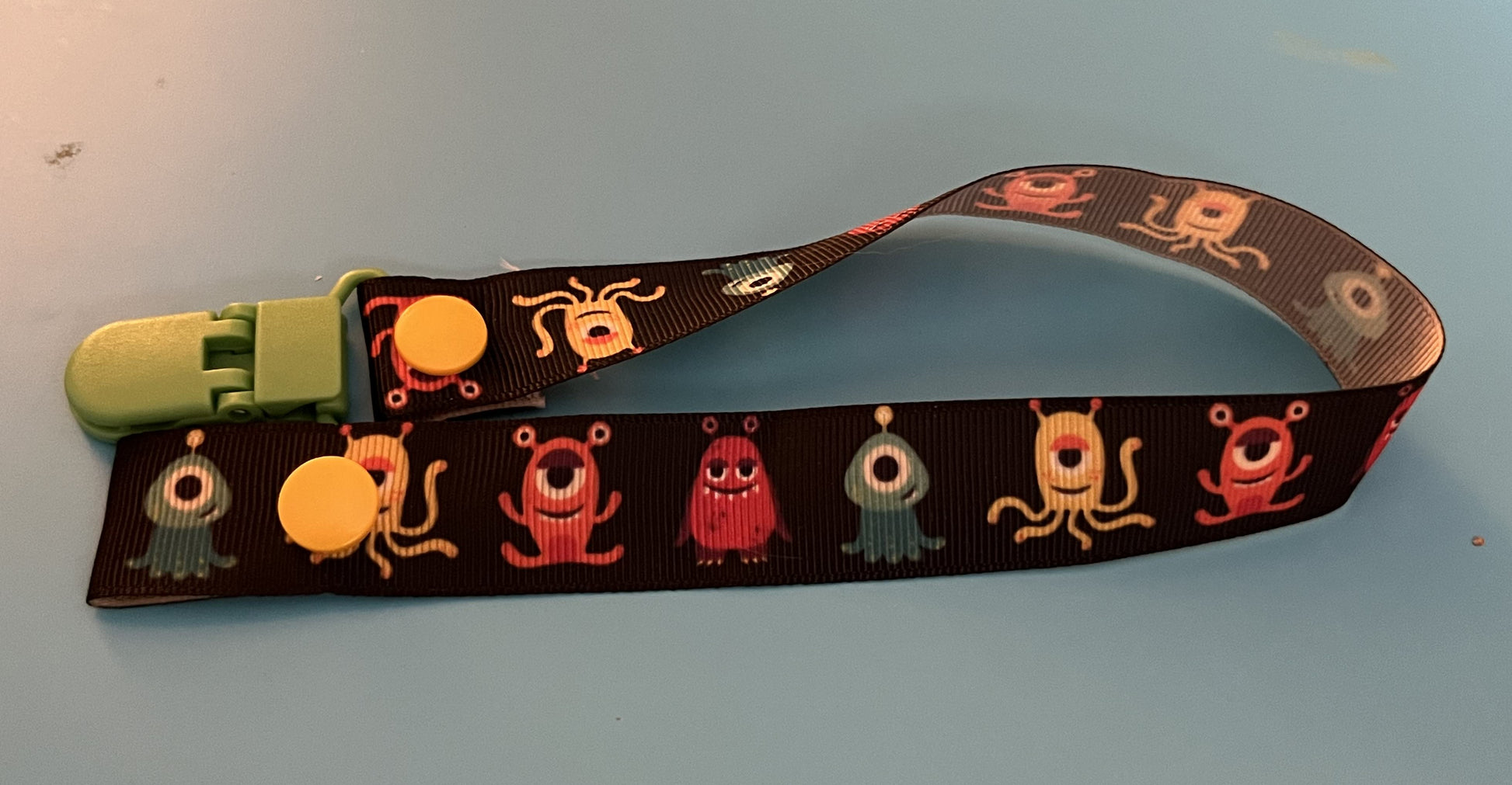 This is a pacifier clip made from grosgrain ribbon. It has a pattern of monsters. If you want the clip and/or snaps a certain color, please tell me, as they are usually chosen at random.