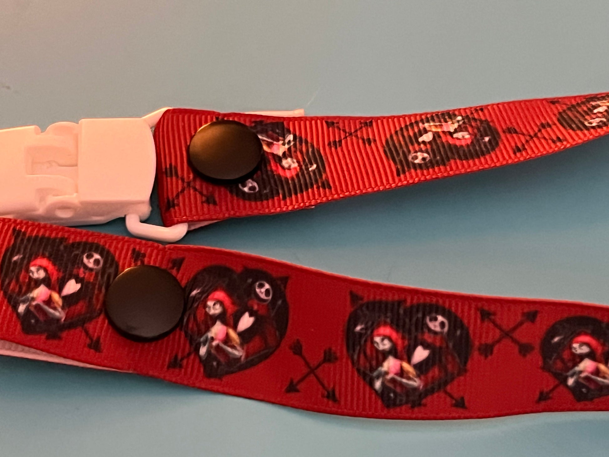 This is a pacifier clip made from grosgrain ribbon. It has a pattern of Jack & Sally from Nightmare Before Christmas. If you want the clip and/or snaps a certain color, please tell me, as they are usually chosen at random.