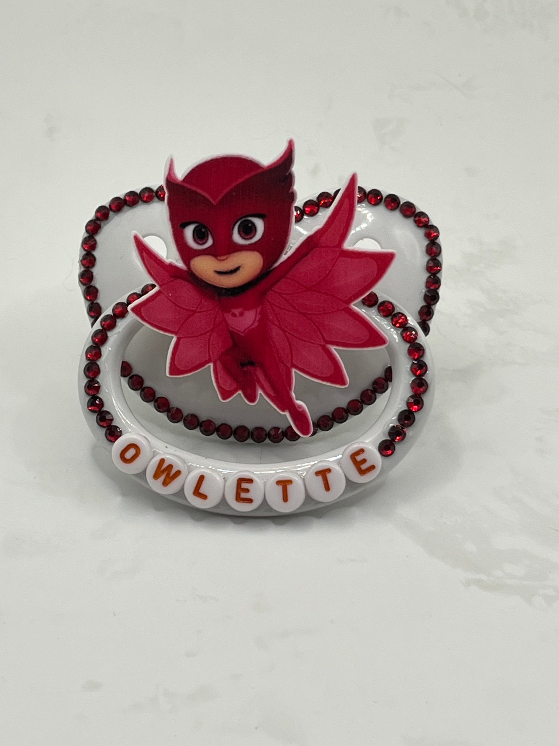 This is a white adult pacifier with an Owlette center. It's outlined in red rhinestones and says "Owlette" on the handle in red and white alpha beads.