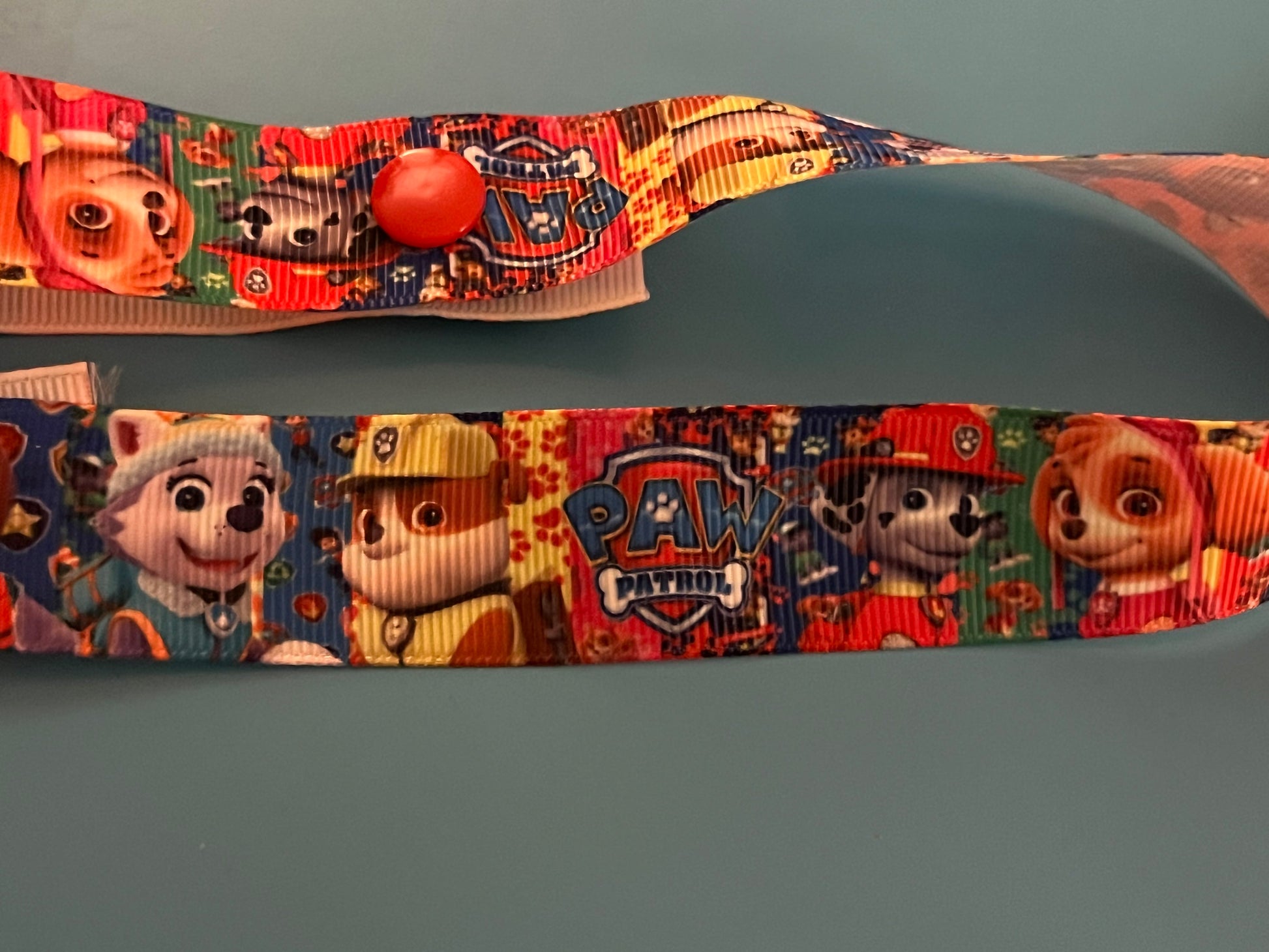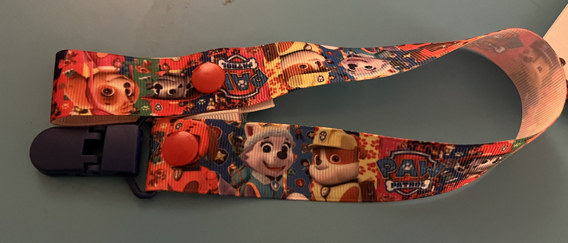 This is a pacifier clip made from grosgrain ribbon. It has a pattern of the Paw Patrol puppies. If you want the clip and/or snaps a certain color, please tell me, as they are usually chosen at random.