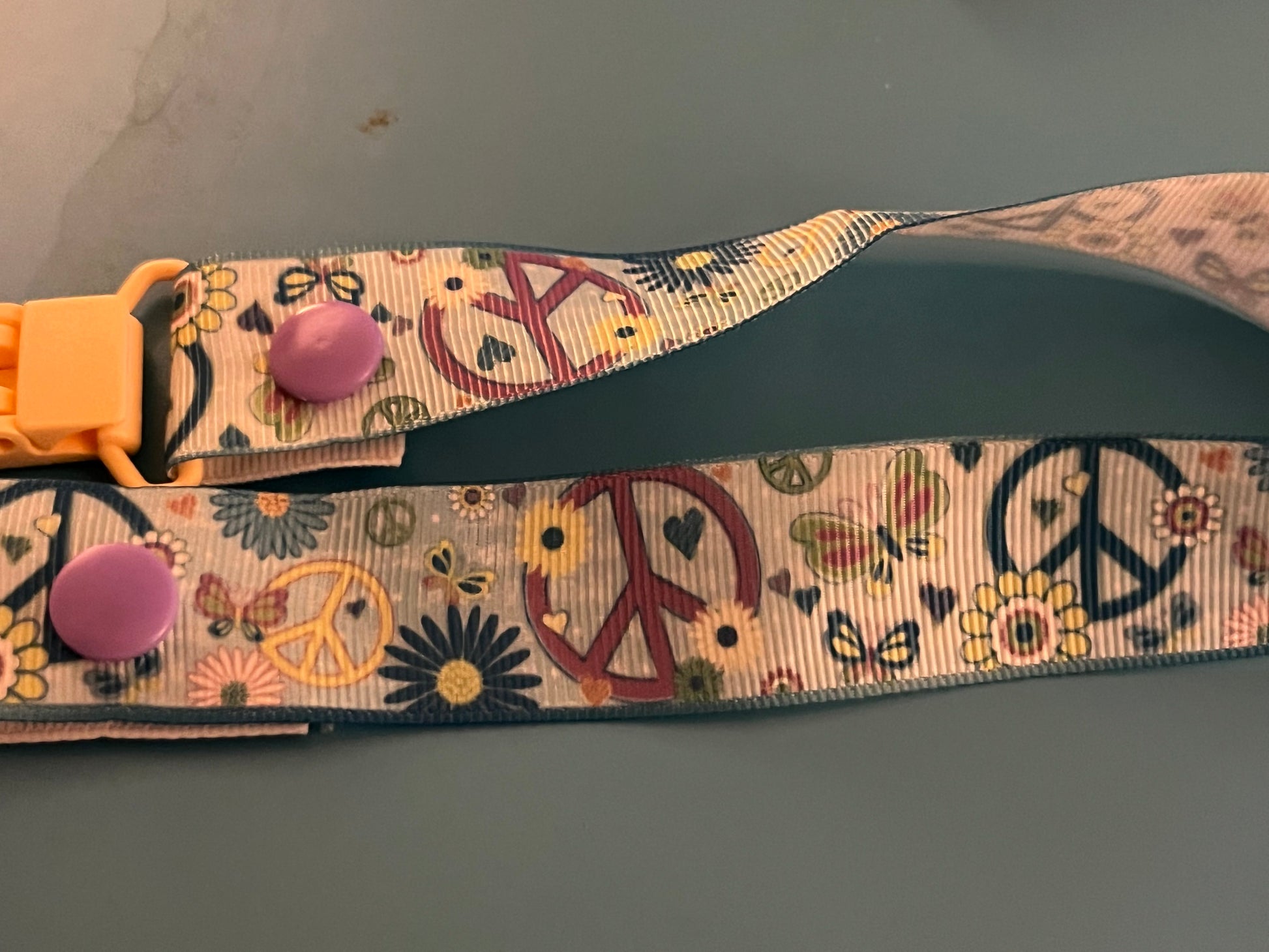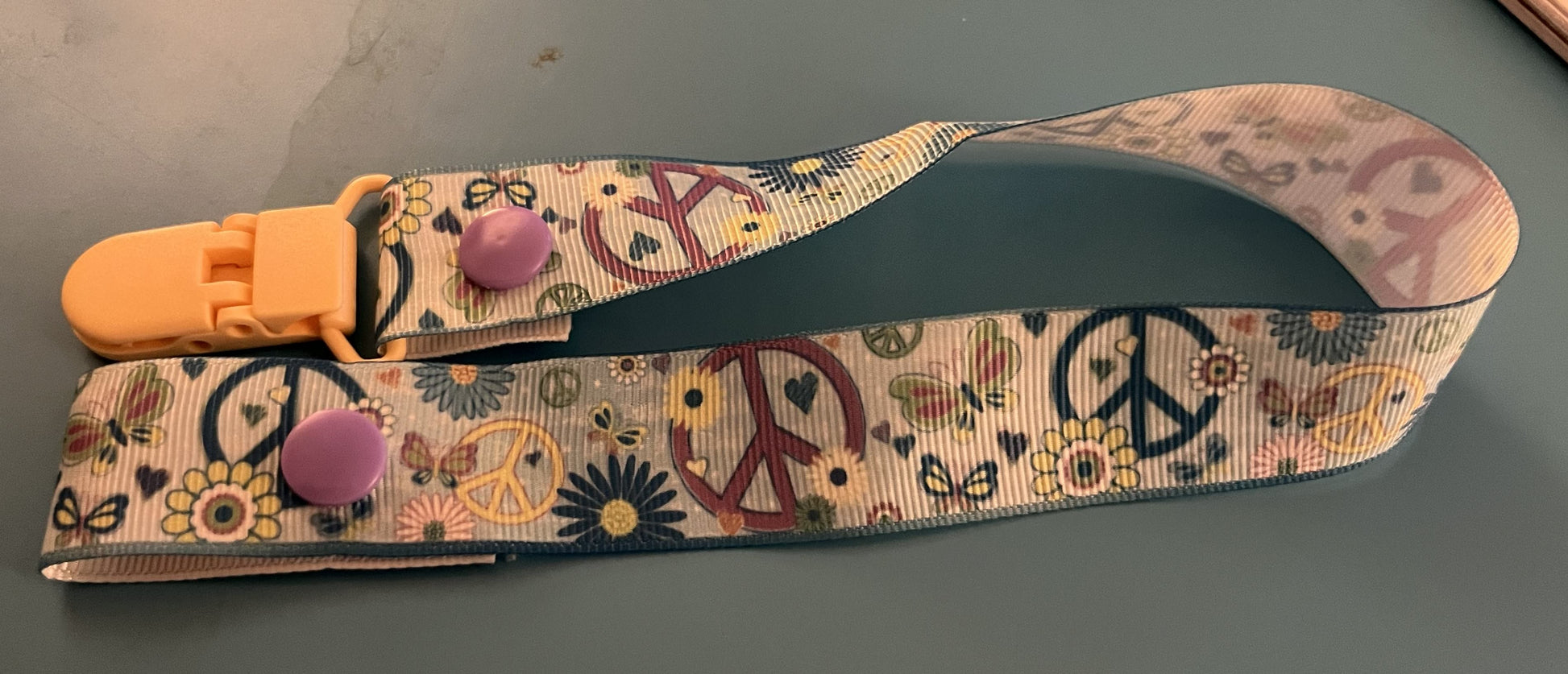 This is a pacifier clip made from grosgrain ribbon. It has a pattern of peace signs and flowers. If you want the clip and/or snaps a certain color, please tell me, as they are usually chosen at random.