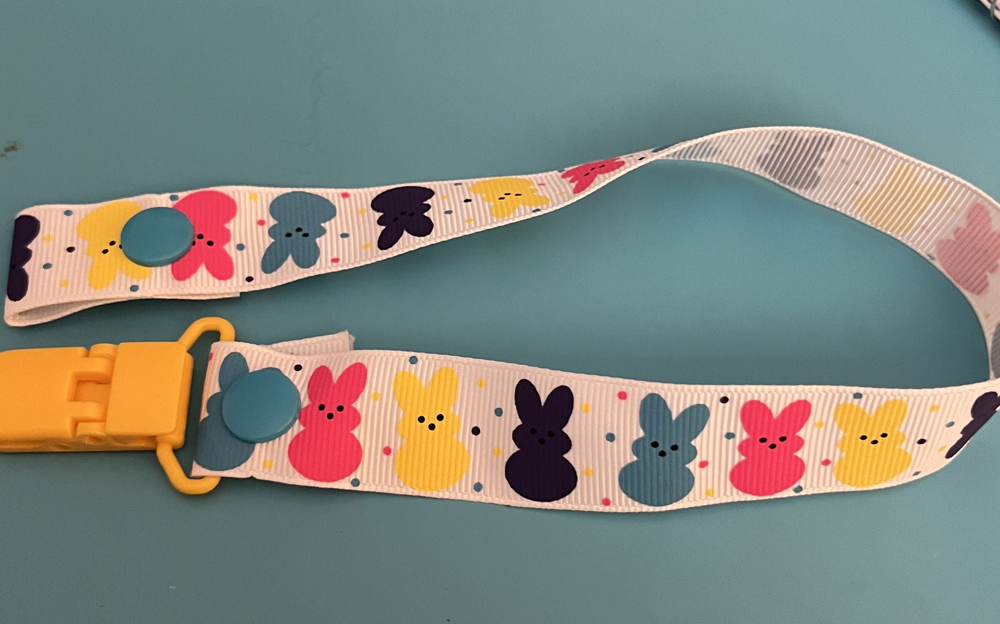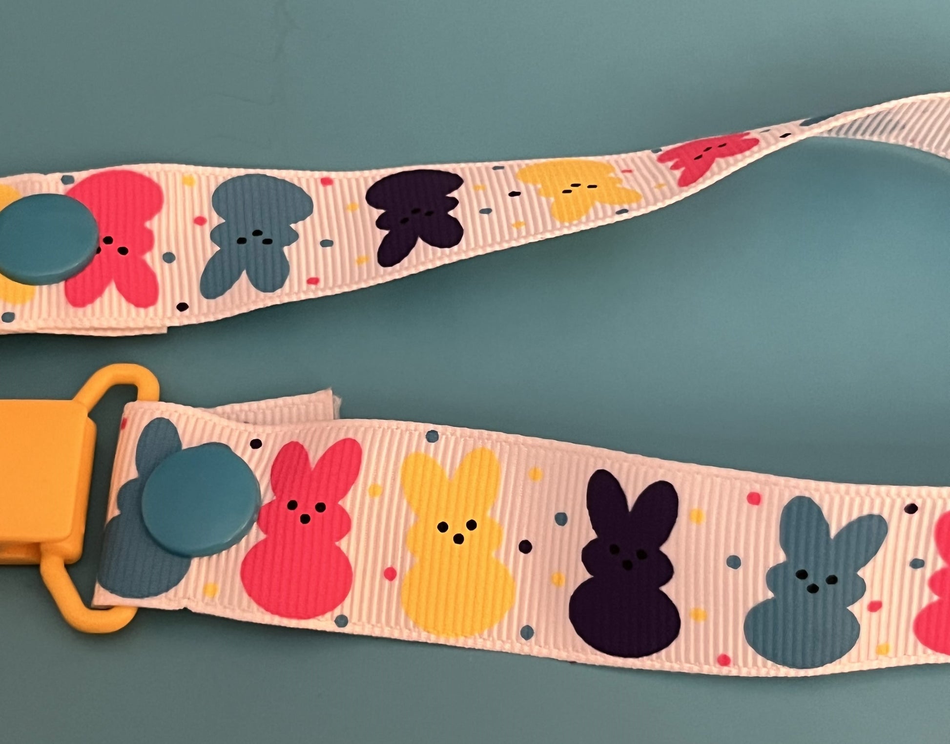 This is a pacifier clip made from grosgrain ribbon. It has a pattern of bunny Peeps. If you want the clip and/or snaps a certain color, please tell me, as they are usually chosen at random.