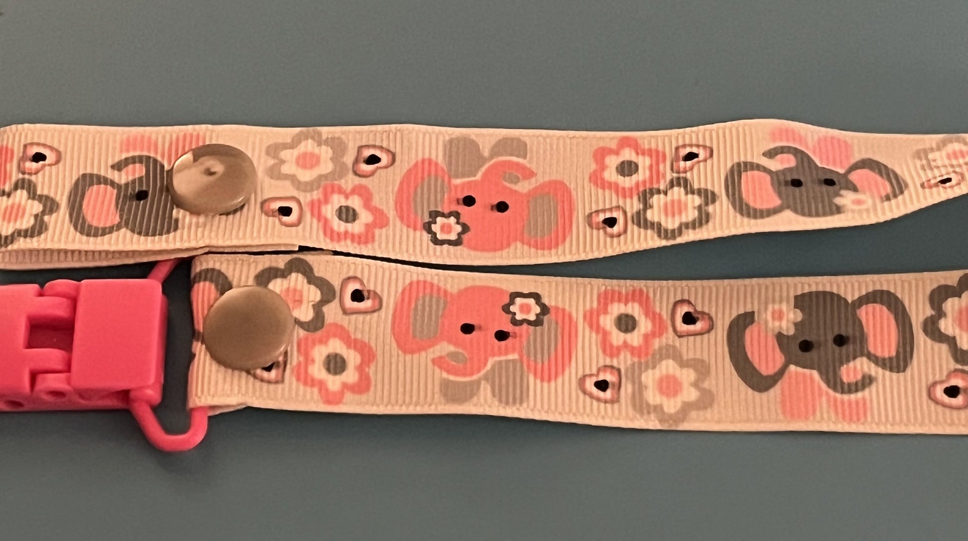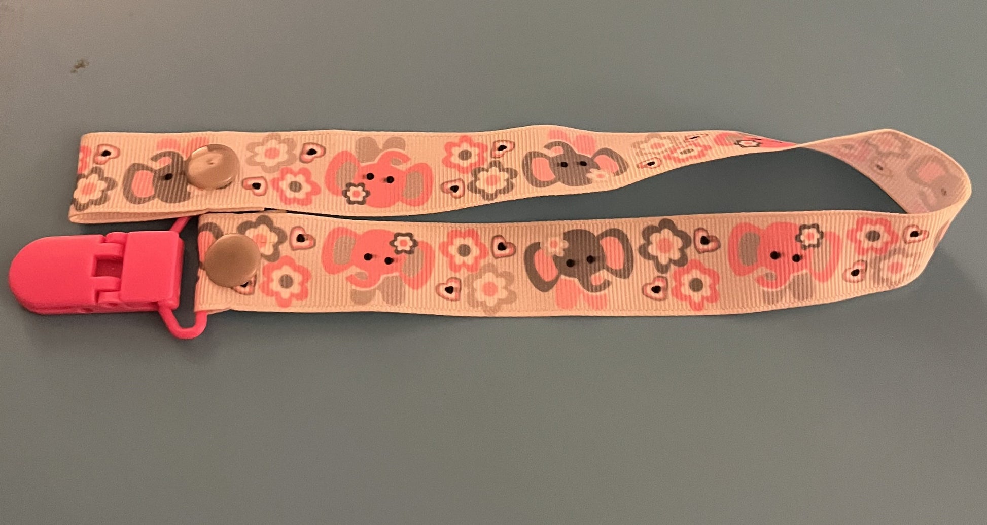 This is a pacifier clip made from grosgrain ribbon. It has a pattern of pink and gray elephants with flowers. If you want the clip and/or snaps a certain color, please tell me, as they are usually chosen at random.