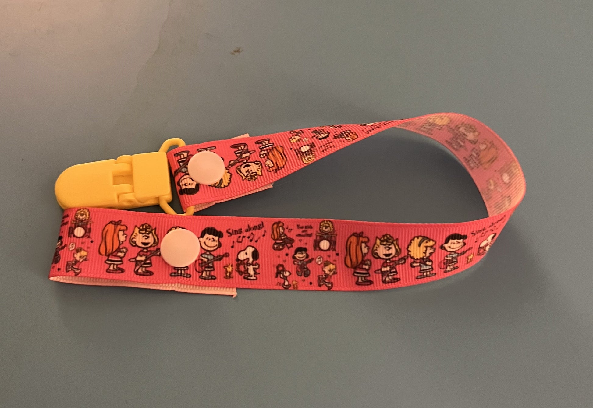 This is a pacifier clip made from grosgrain ribbon. It features a pattern of the Peanuts Gang. If you want the clip and/or snaps a certain color, please tell me, as they are usually chosen at random.
