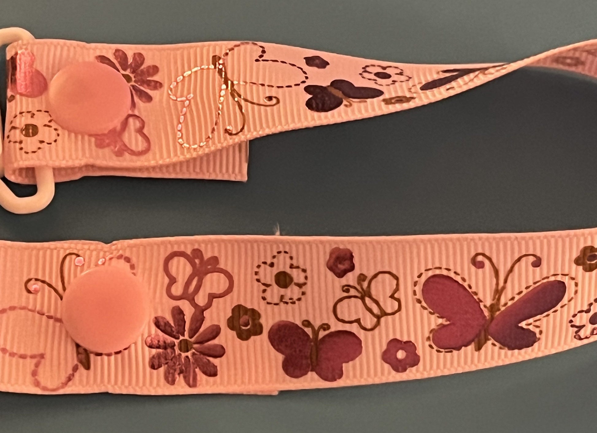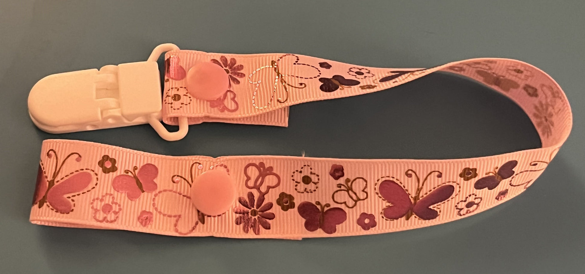 This is a pacifier clip made from grosgrain ribbon. It has a pattern of pink and purple butterflies and flowers. If you want the clip and/or snaps a certain color, please tell me, as they are usually chosen at random.