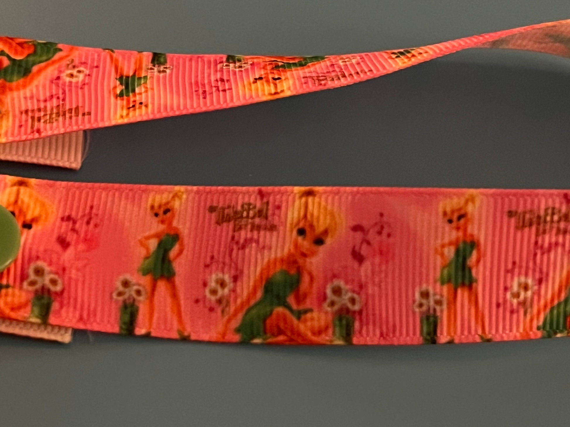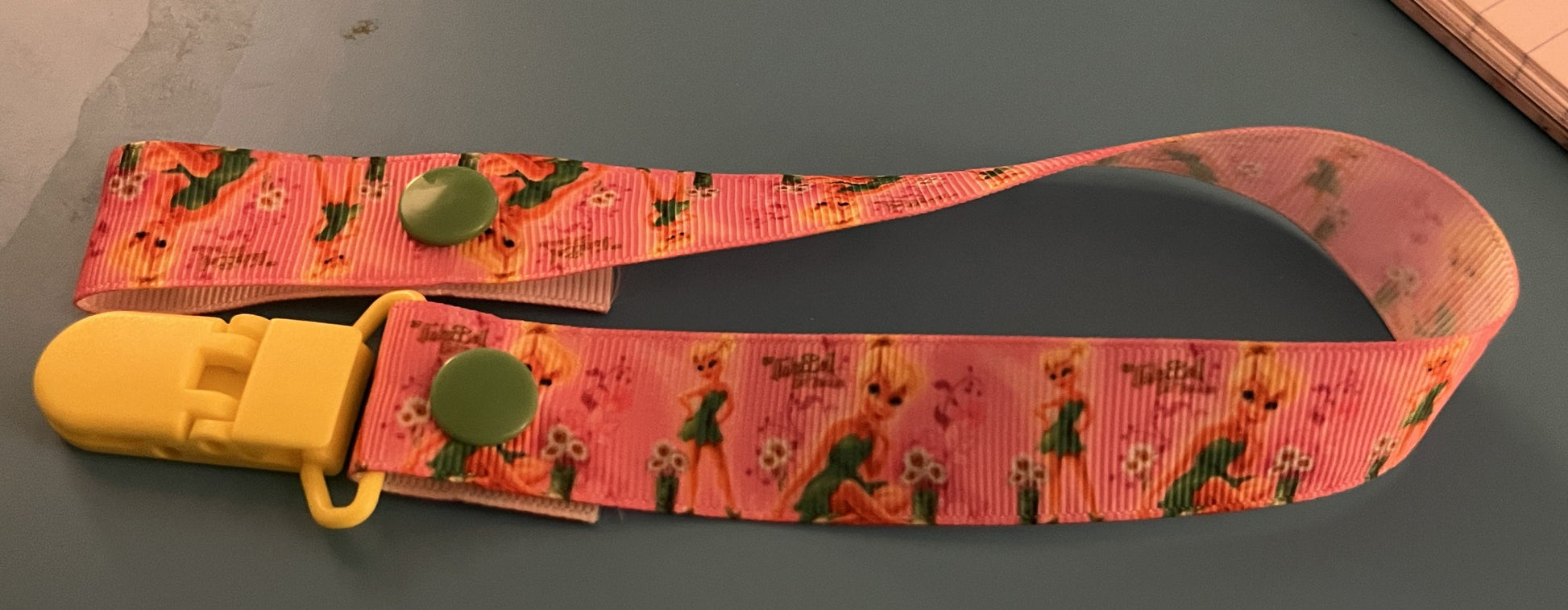 This is a pacifier clip made from grosgrain ribbon. It has a patter of Tinkerbell. If you want the clip and/or snaps a certain color, please tell me, as they are usually chosen at random.