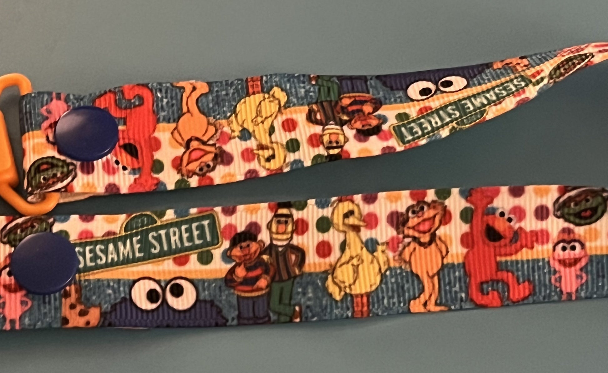 This is a pacifier clip made from grosgrain ribbon. It has a pattern of Sesame Street characters along with a background of polka dots. If you want the clip and/or snaps a certain color, please tell me, as they are usually chosen at random.
