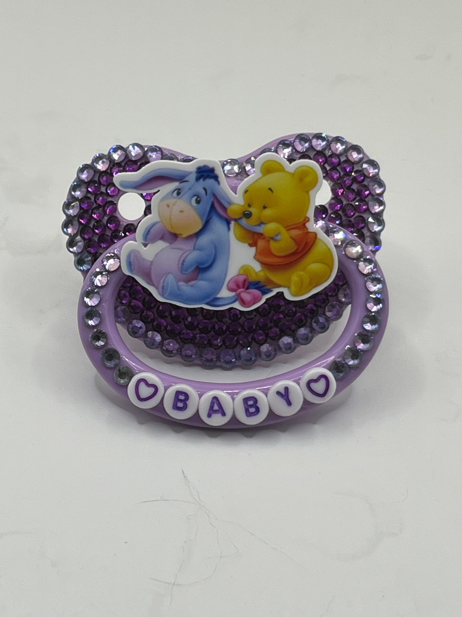 This is a lavender adult pacifier with a Pooh and Eeyore center. It's outlined in violet rhinestones and covered in dark purple rhinestones. "Baby" is written on the handle in purple alpha beads with two hearts.