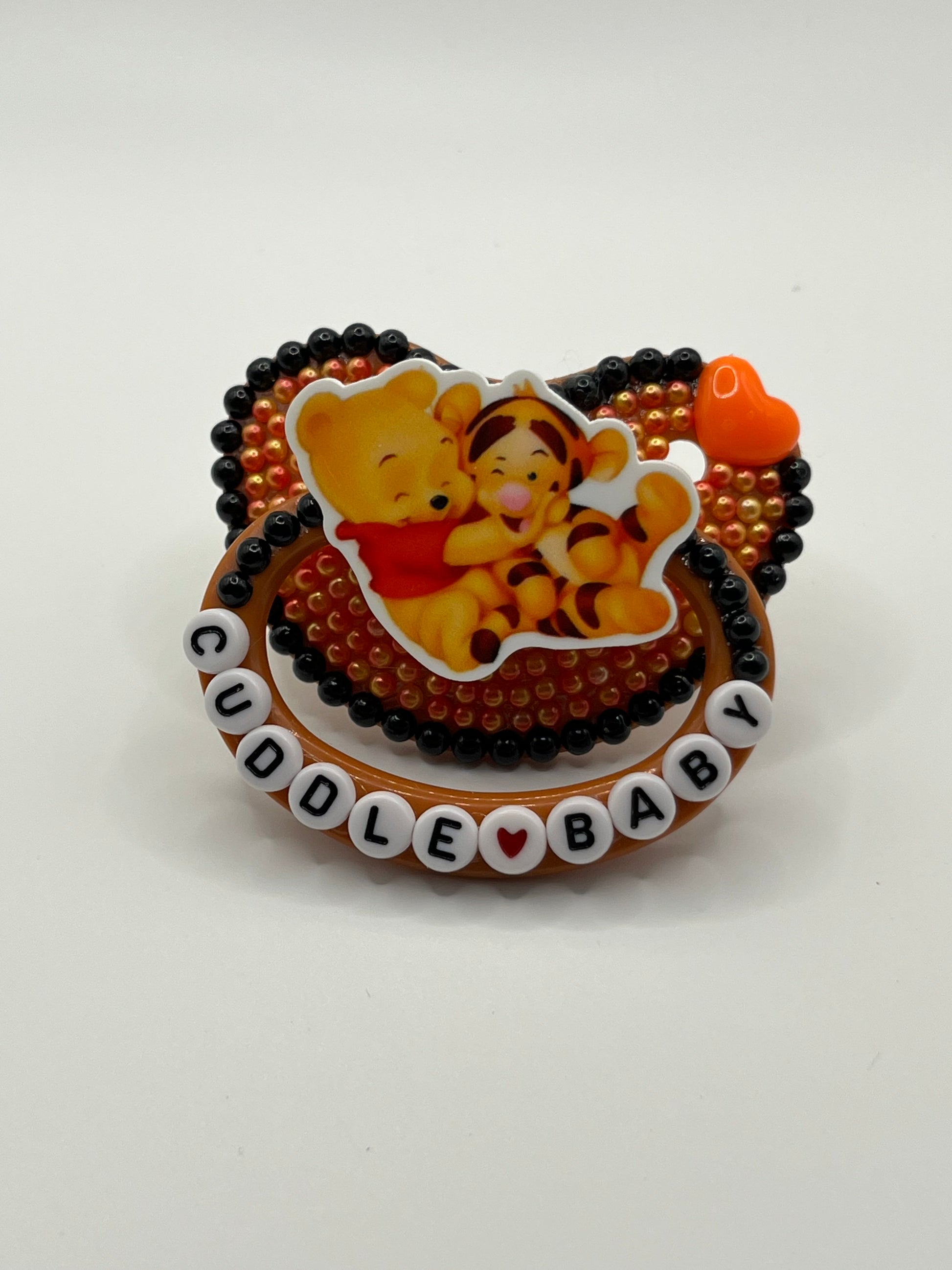 This is a dark orange adult pacifier with a Pooh & Tigger center. It has an orange heart in the right-hand corner of the shield. It's outlined with black pearls and covered with red and yellow ombre pearls. "Cuddle Baby" is written on the handle in black and white alpha beads with a heart.
