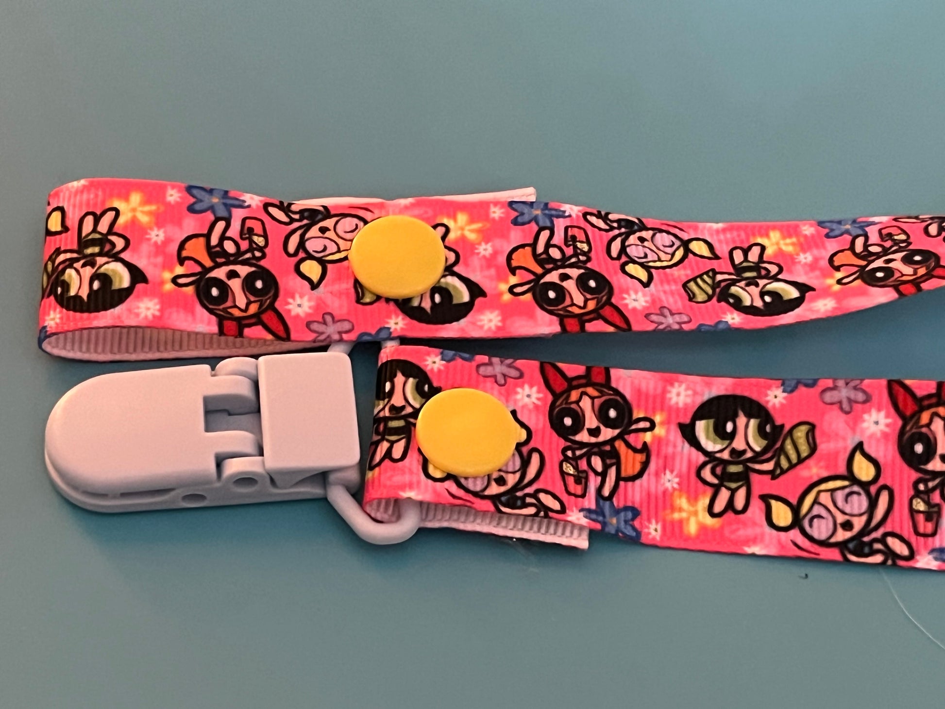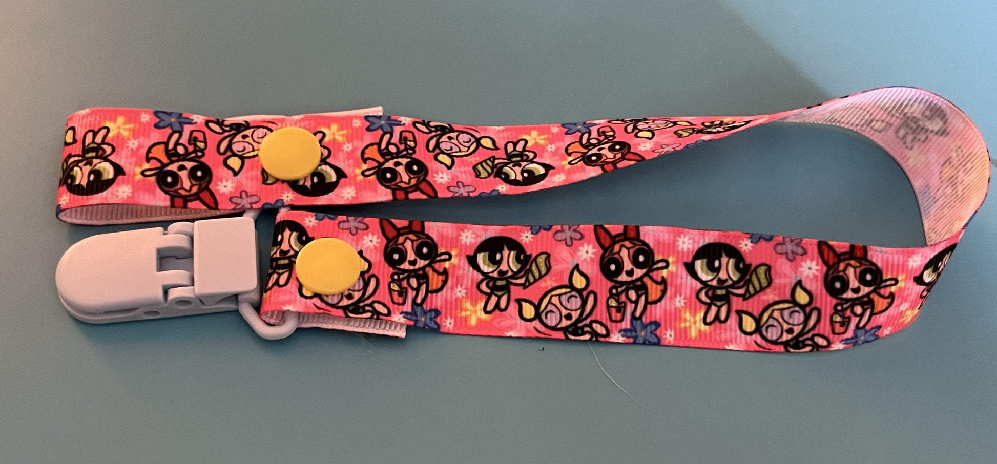 This is a pacifier clip made from grosgrain ribbon. It has a pattern of the Powerpuff Girls. If you want the clip and/or snaps a certain color, please tell me, as they are usually chosen at random.