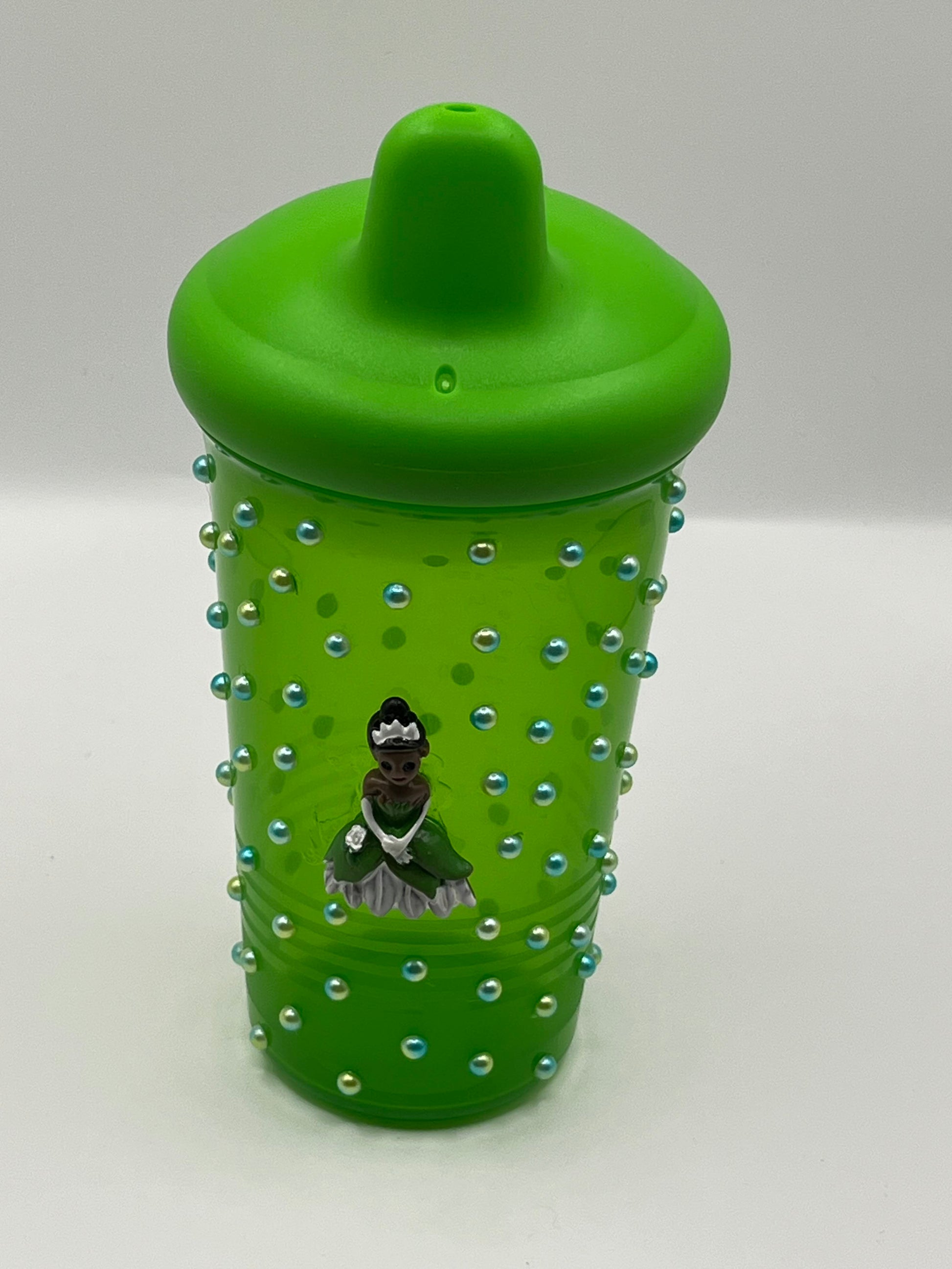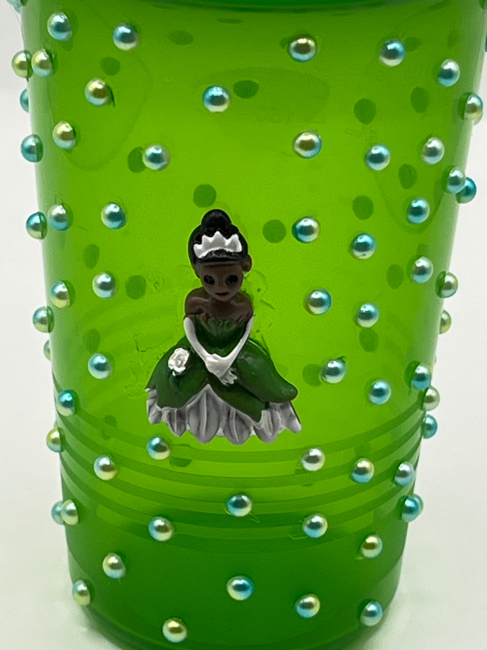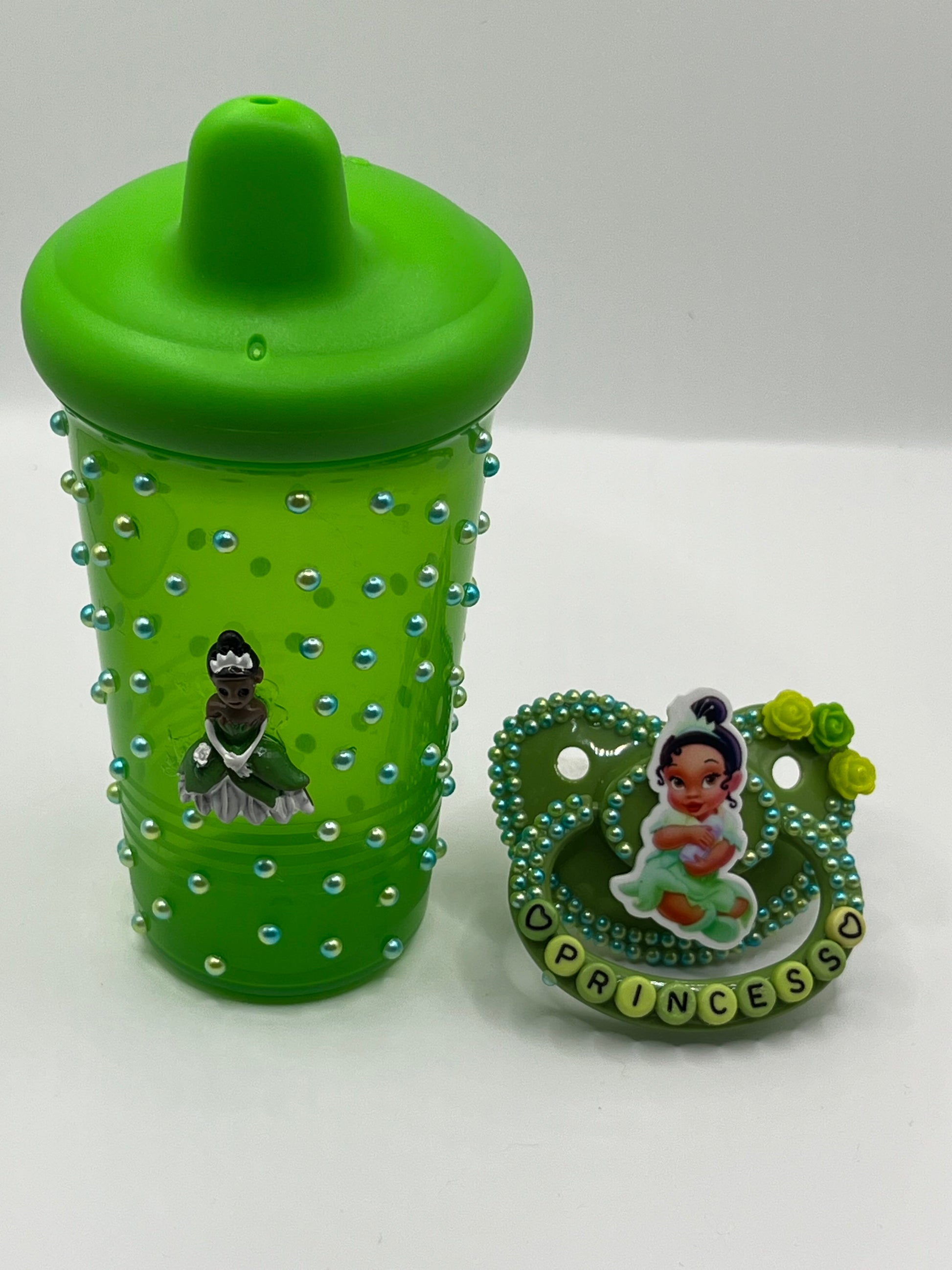 This is a paci and sippy set featuring Princess Tiana from The Princess and the Frog. The sippy is green, decorated with green ombre pearls. The paci has three green roses on the right-hand side of the shield and is outlined with green ombre pearls. "Princess" is written on the handle in green alpha beads.