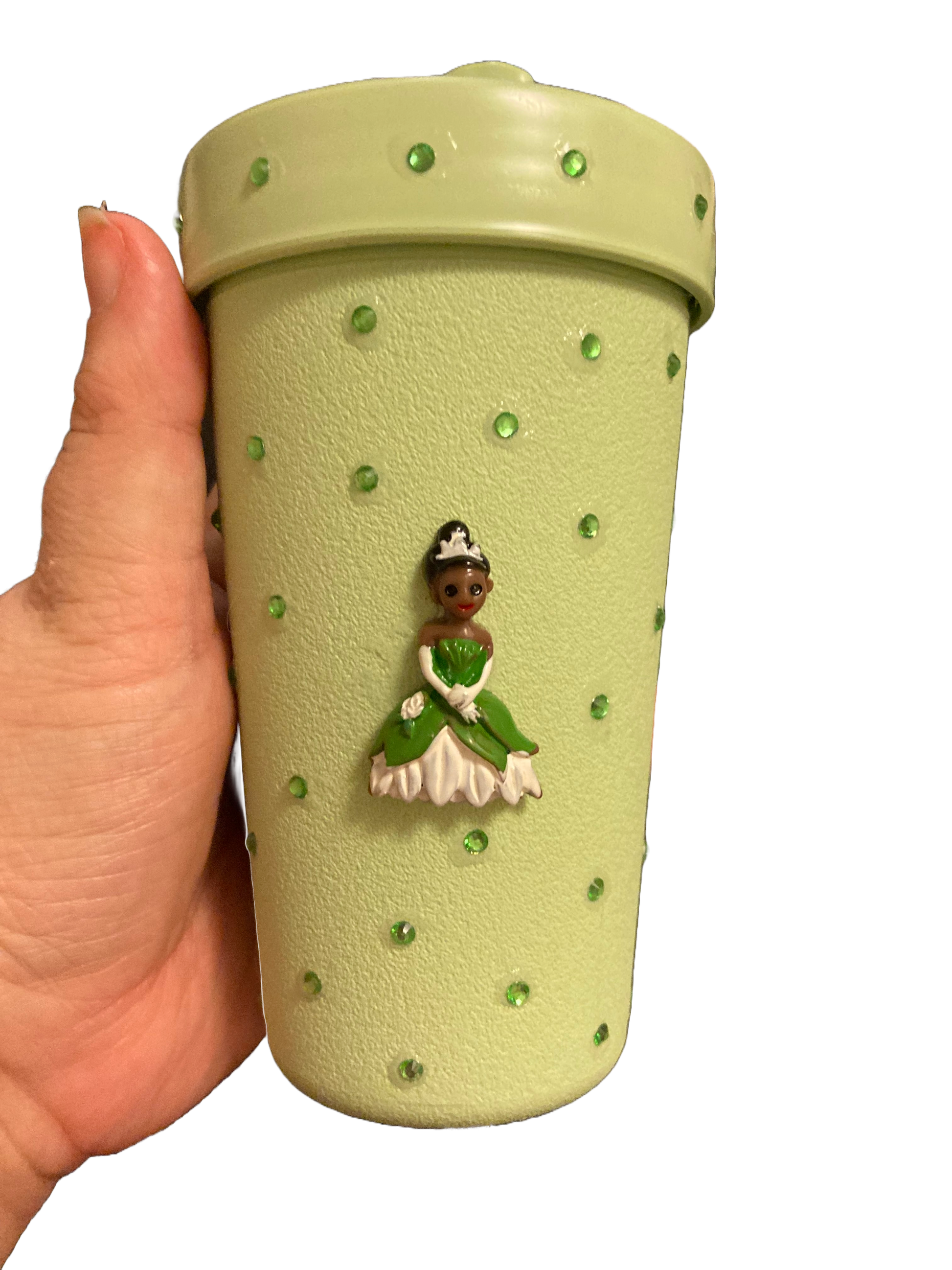 This is a light green sippy cup with a Princess Tiana center. It is covered in green rhinestones. The cup holds 8oz and is spillproof.