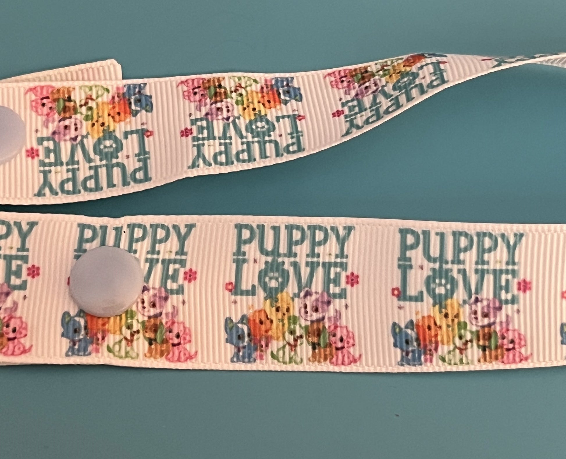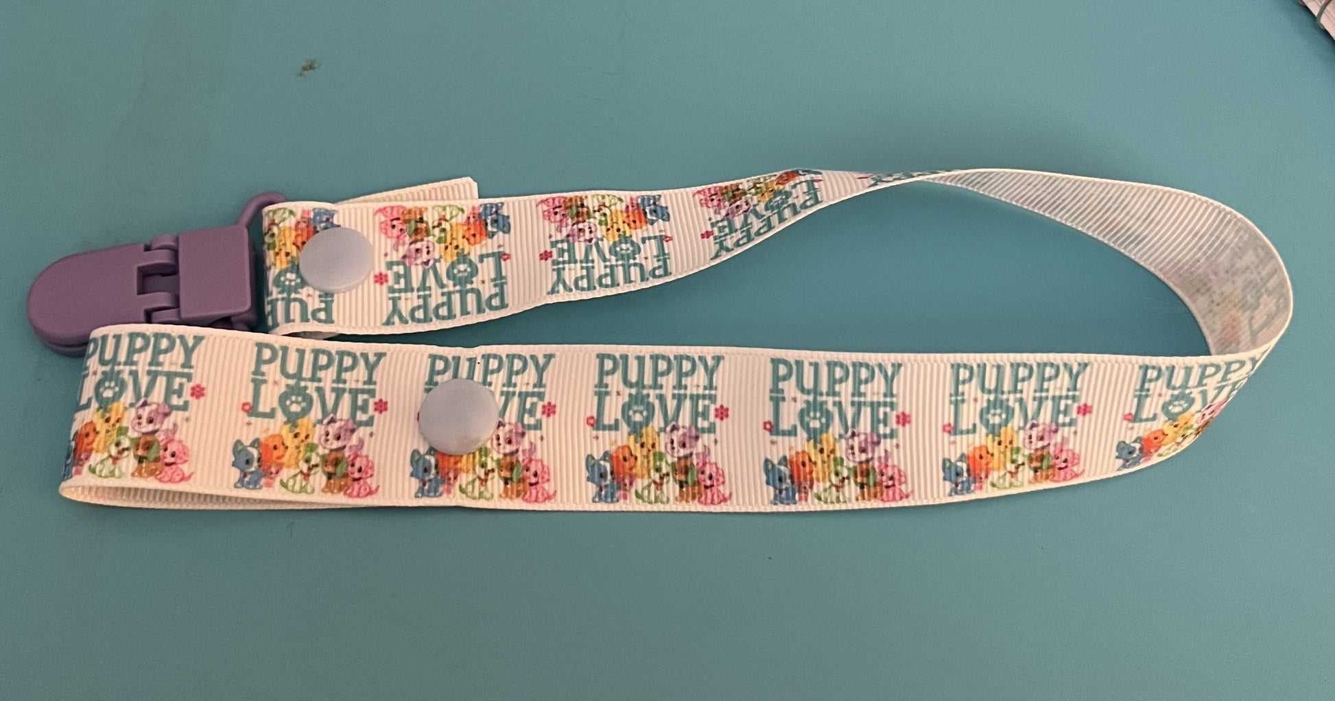 This is a pacifier clip made from grosgrain ribbon. It has a pattern with puppies and says "Puppy Love" in blue text. If you want the clip and/or snaps a certain color, please tell me, as they are usually chosen at random.