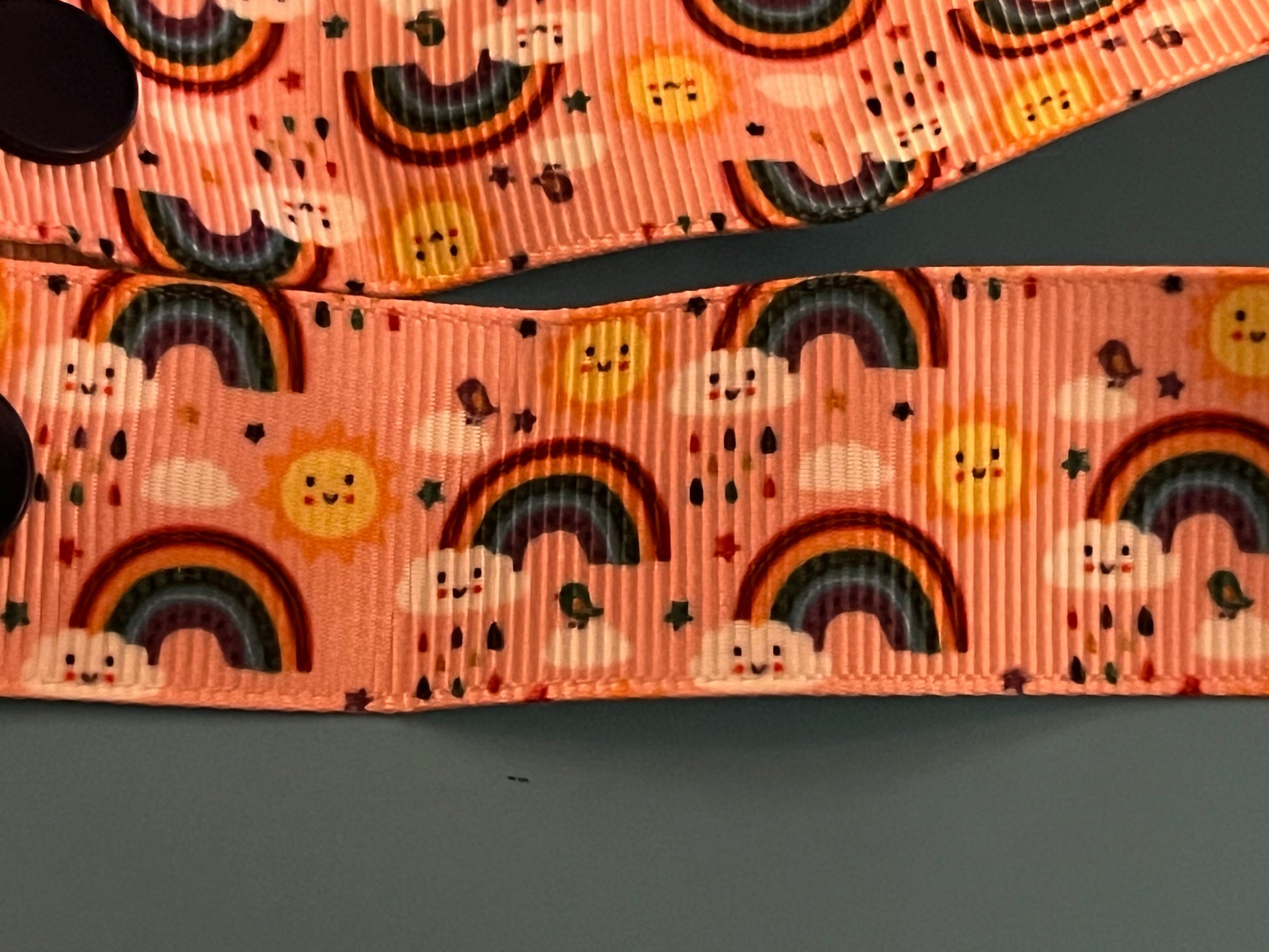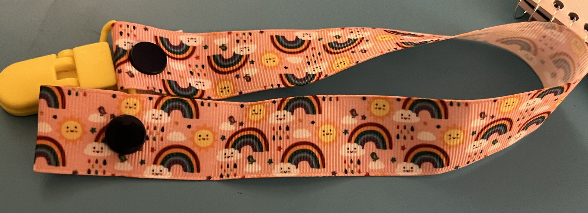 This is a pacifier clip made from grosgrain ribbon. It has a pattern of rainbows, suns, and rainy clouds. If you want the clip and/or snaps a certain color, please tell me, as they are usually chosen at random.