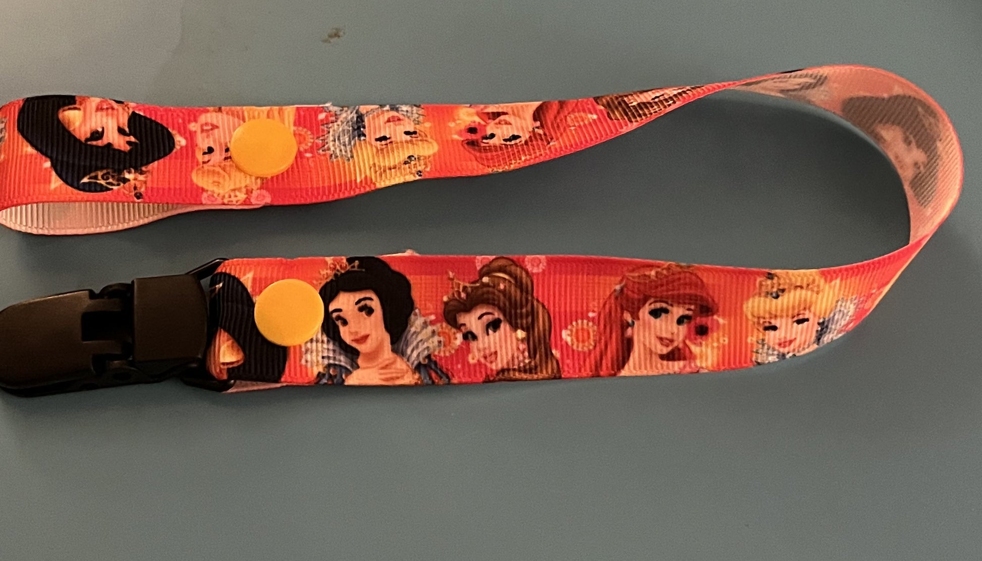 This is a pacifier clip made from grosgrain ribbon. It has a pattern of the Disney princesses. Princesses included are Jasmine, Aurora, Cinderella, Ariel, Belle, and Snow White. If you want the clip and/or snaps a certain color, please tell me, as they are usually chosen at random.